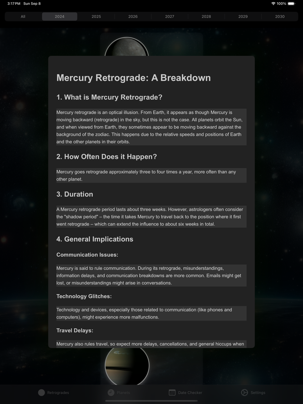 3 ***Enhance your astrological insights with Retrograde Checker!** Perfect for astrology enthusiasts, this feature allows you to explore planetary retrogrades across a wide range of dates, helping you better understand and plan around these significant astrological events.