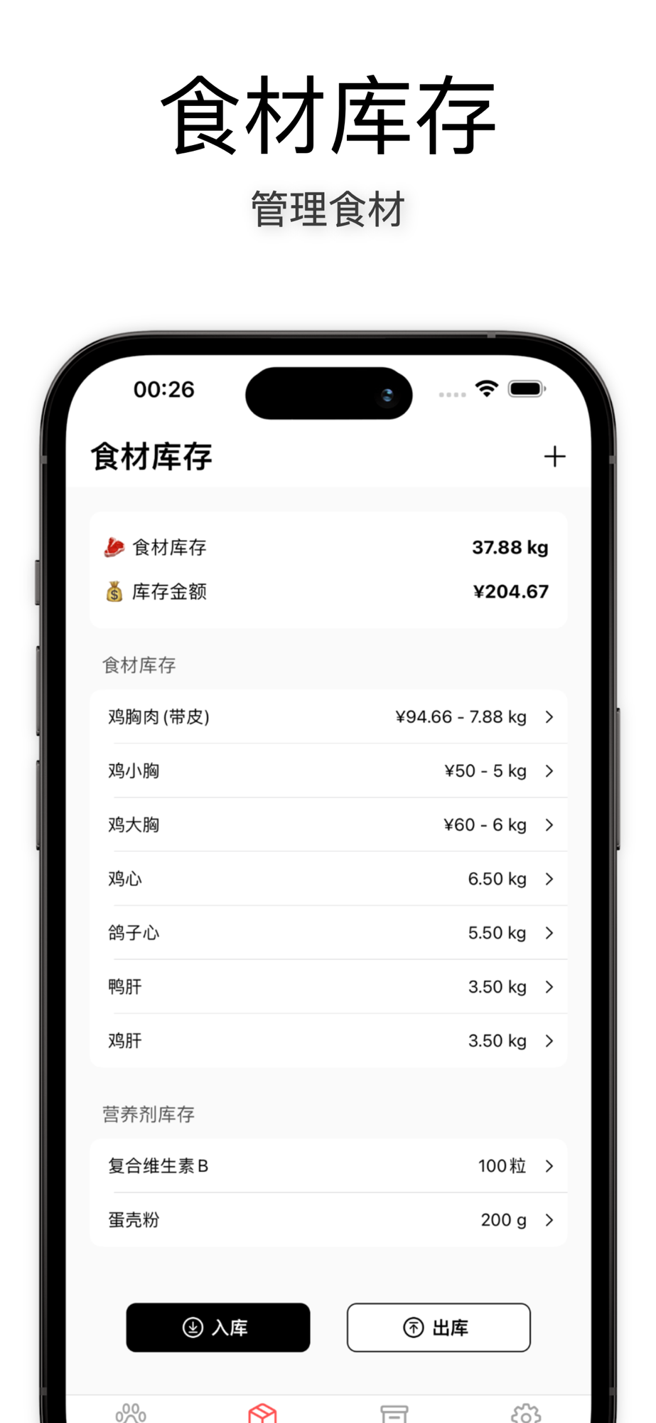 食材库存管理: 记录日常屯肉数据,结合喂食记录进行核减,同时提供库存流水和库存金额的分析。