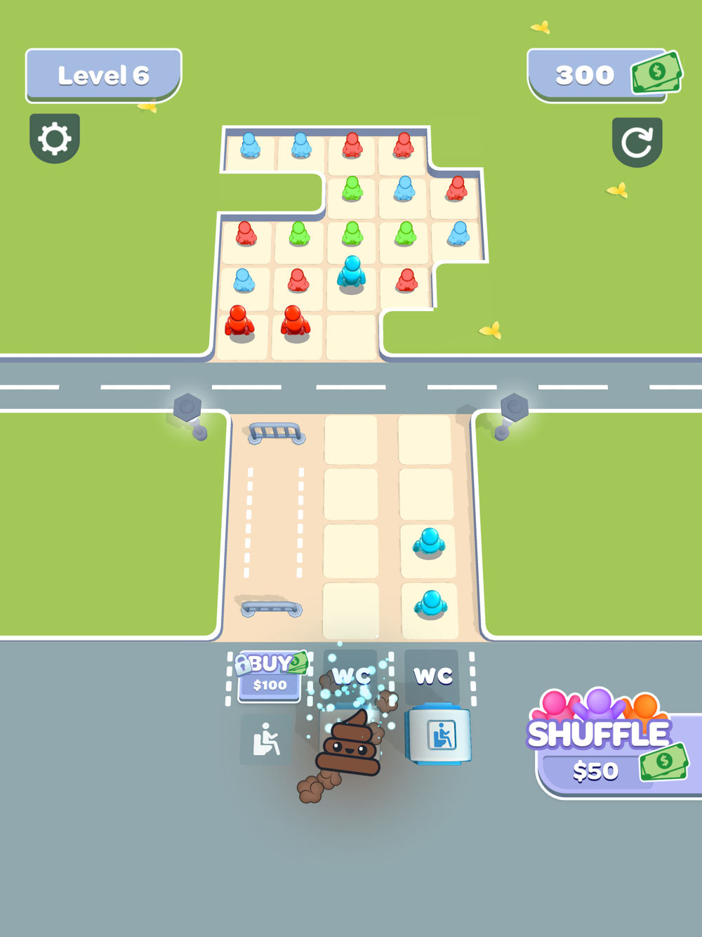Toilet Queue is a color-sorting puzzle game where you aim to sort the people in the queue by their colors and make them use the toilets.