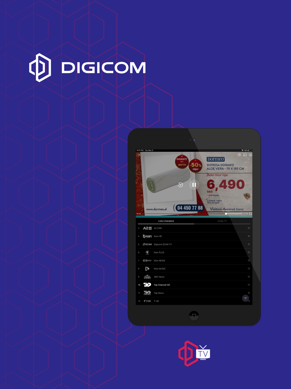 Me Digicom TV, ju do të shijoni kënaqësinë e televizionit me një programacion të larmishëm për çdo kategori kinema, femijë, lifestyle, dokumentarë, sport, etj.