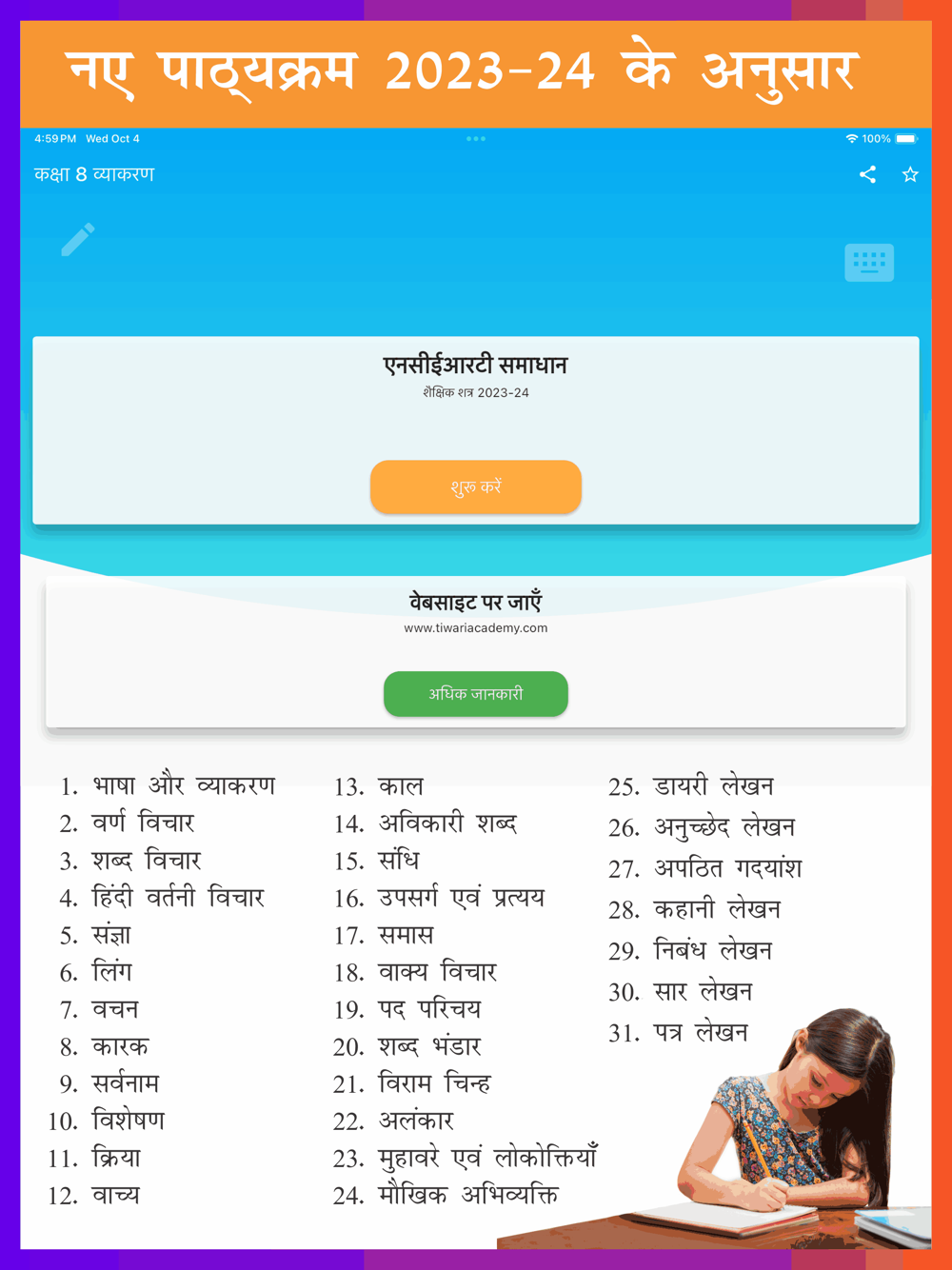 Class 8 Hindi Vyakaran Book app is useful for all students of CBSE and State board for new academic session 2023-24. The class 8 Hindi grammar book contains the following chapters: