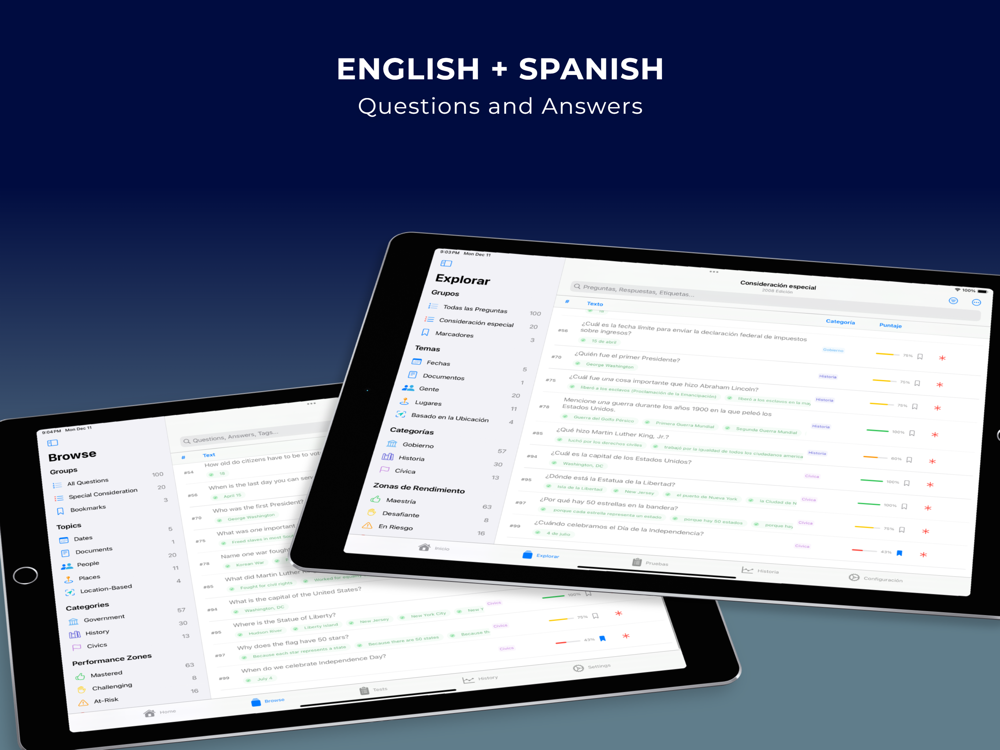 • English and Spanish localizations for both the app and test questions and answers in a single download
