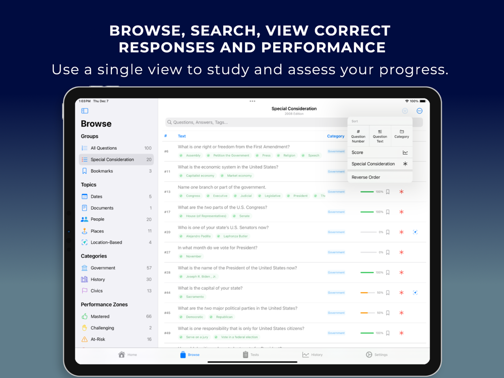 • Study, browse, search, and preview correct responses to the civics test questions in both English and Spanish.