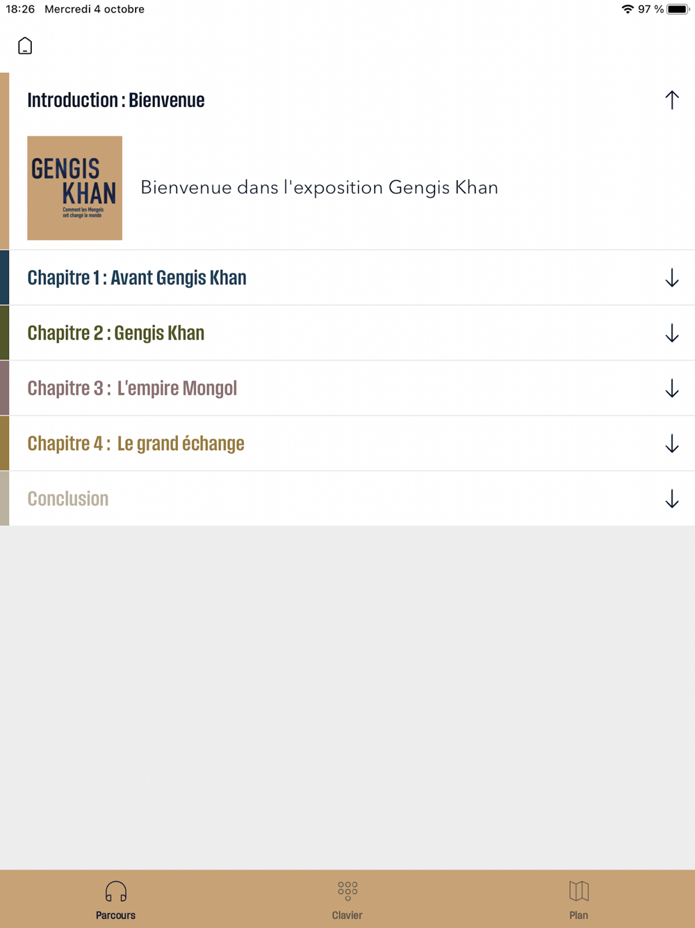 • Parcours « adulte » : avancez en autonomie dans l’exposition et découvrez, grâce à plus de 30 minutes de commentaires audio, la constitution de l’Empire mongol et ses influences sur le reste du monde.