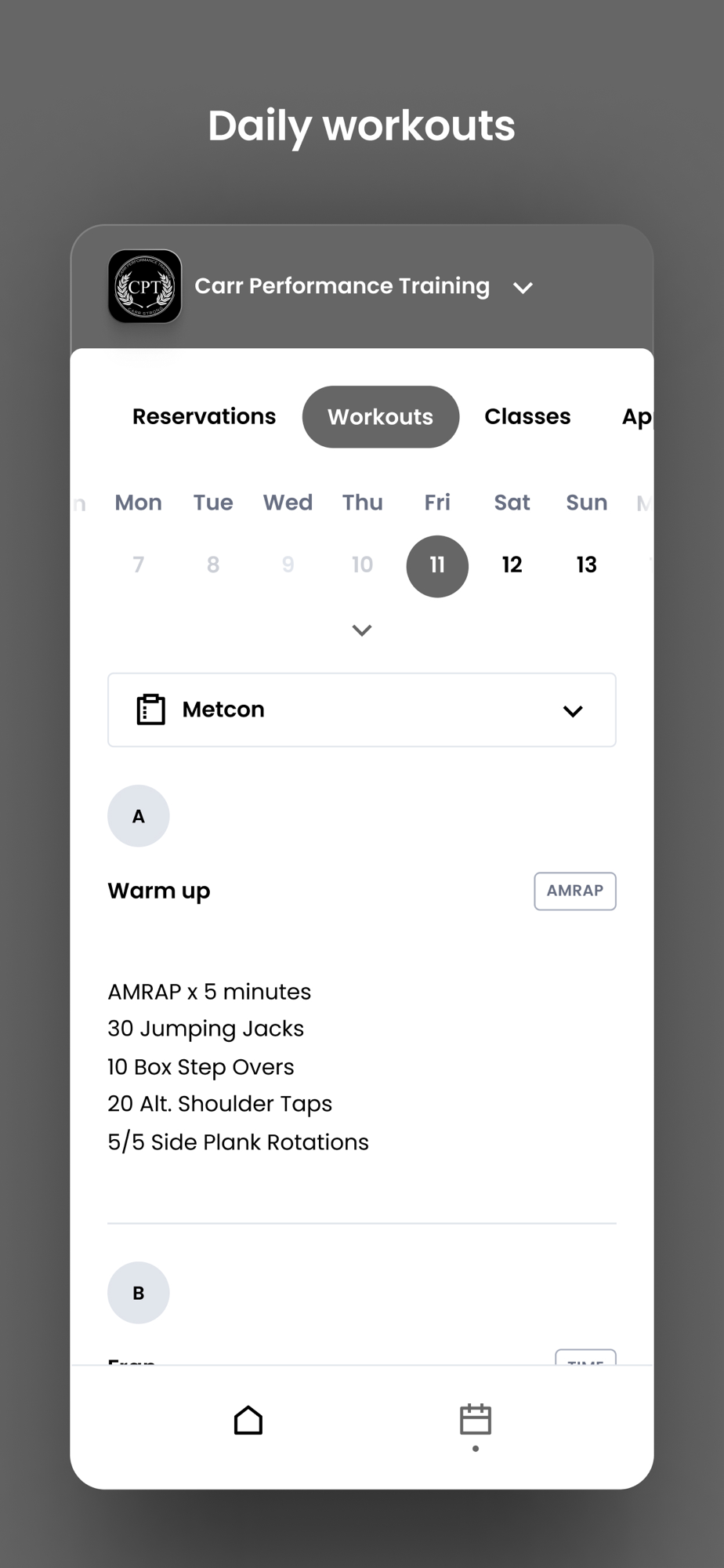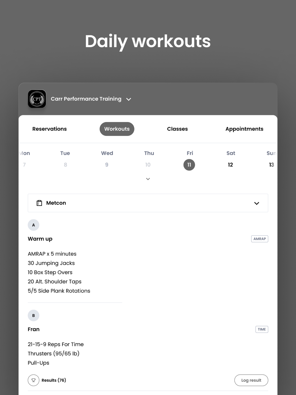 For members of Carr Performance Training to reserve their place in a class, sign up for gym events, and general account management like updating headshots and credit card on file.
