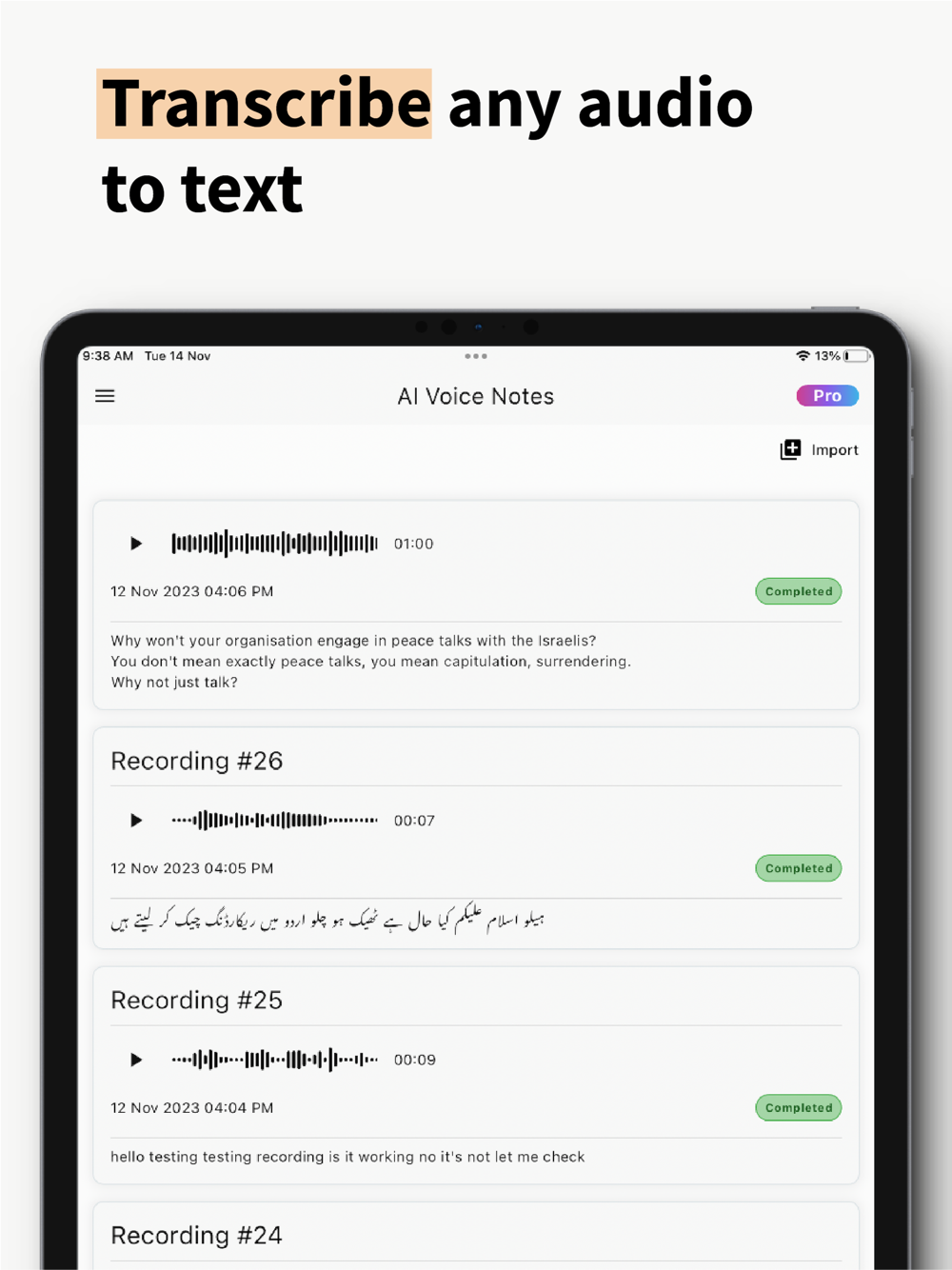 But it doesn't stop there! Waya allows you to import audio files from your library too. Whether it's a recorded interview, an old lecture file or a saved podcast episode - simply upload your audio file and let Waya do the rest.