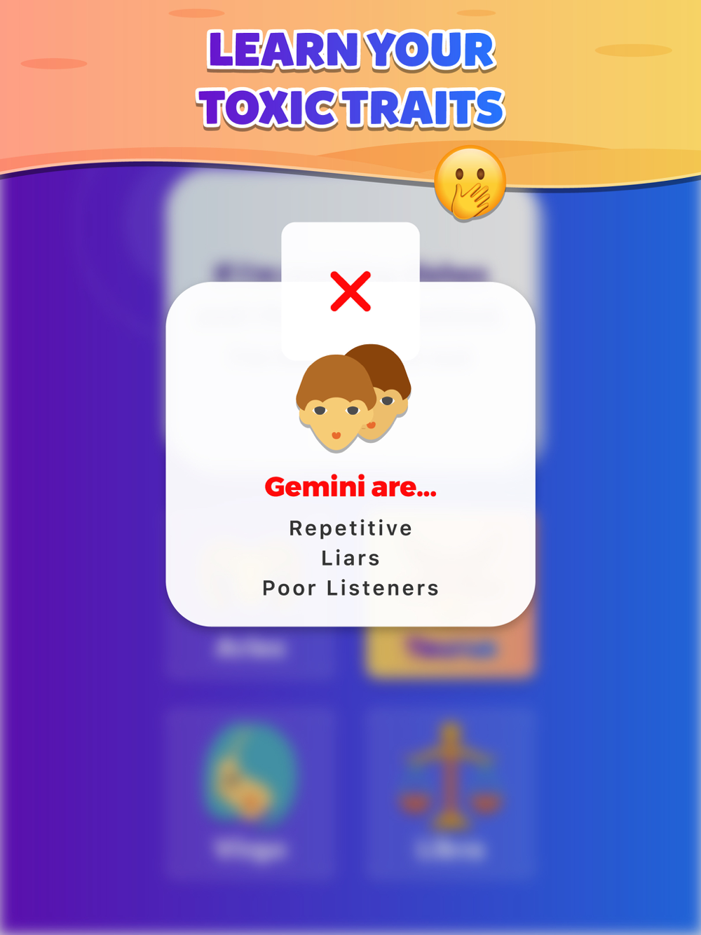 How well do you know your Zodiac signs? Laugh your *ss off and learn more about each Zodiac sign with "What Zodiac Sign is This?" - the ultimate comedy text meme-based trivia app! Brace yourself for a hilarious and enlightening journey through the world of astrology. Test your knowledge of the least favorable traits associated with all 12 zodiac signs and prepare to be entertained like never before. Choose from 4, 8, or 12 zodiac sign answers and immerse yourself in side-splitting comedy text memes that will have you rolling on the floor.