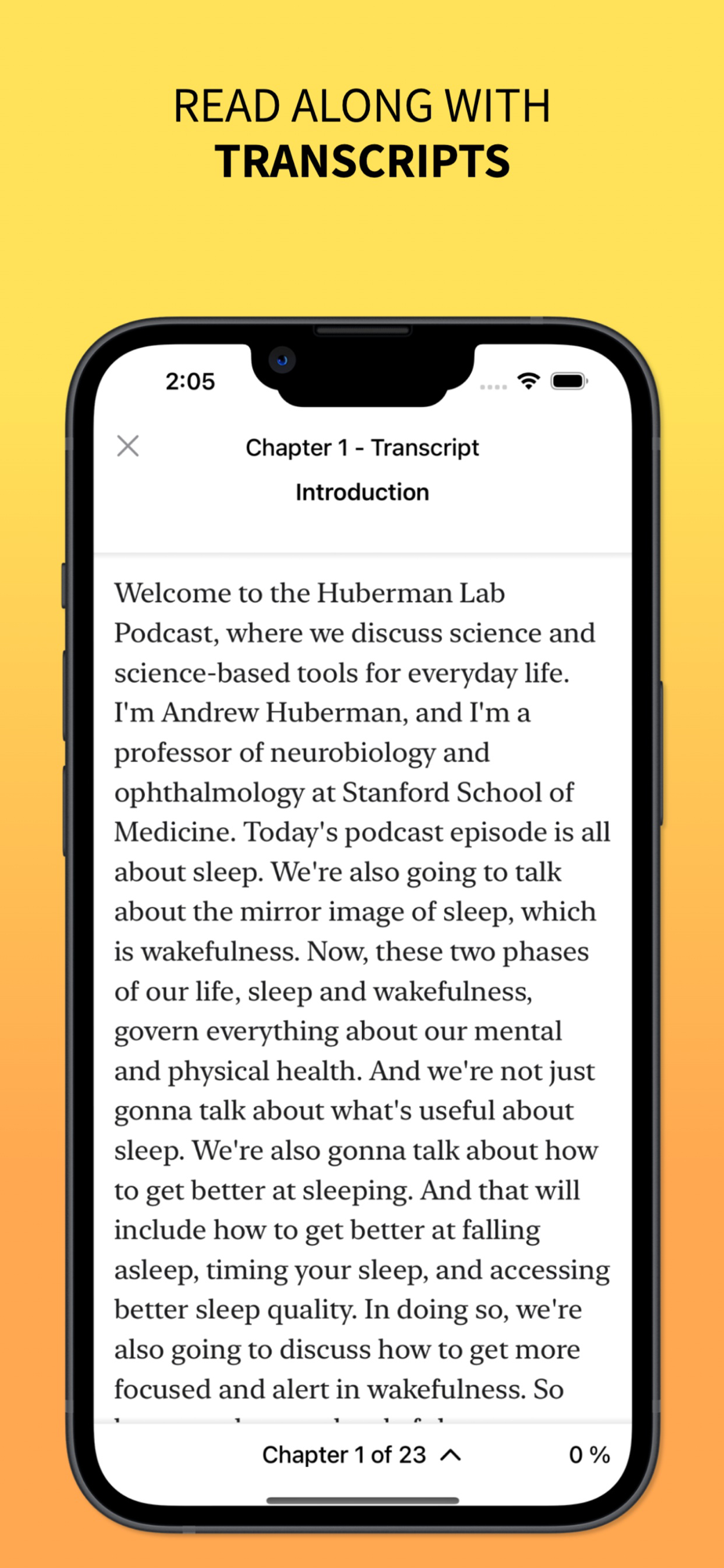 Sleek podcast playback experience, enhanced with transcripts and chapter timestamps.