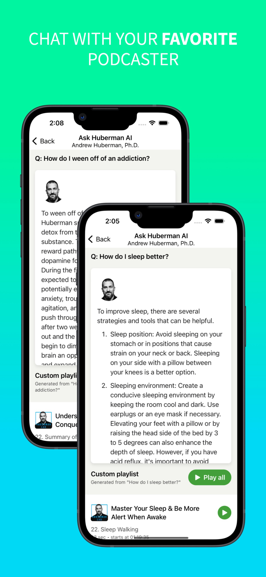 While we're starting with content from the Huberman Lab podcast, we’re hard at work to bring in more knowledge troves. Got a podcast you love? Let us know, and we might just add it next!