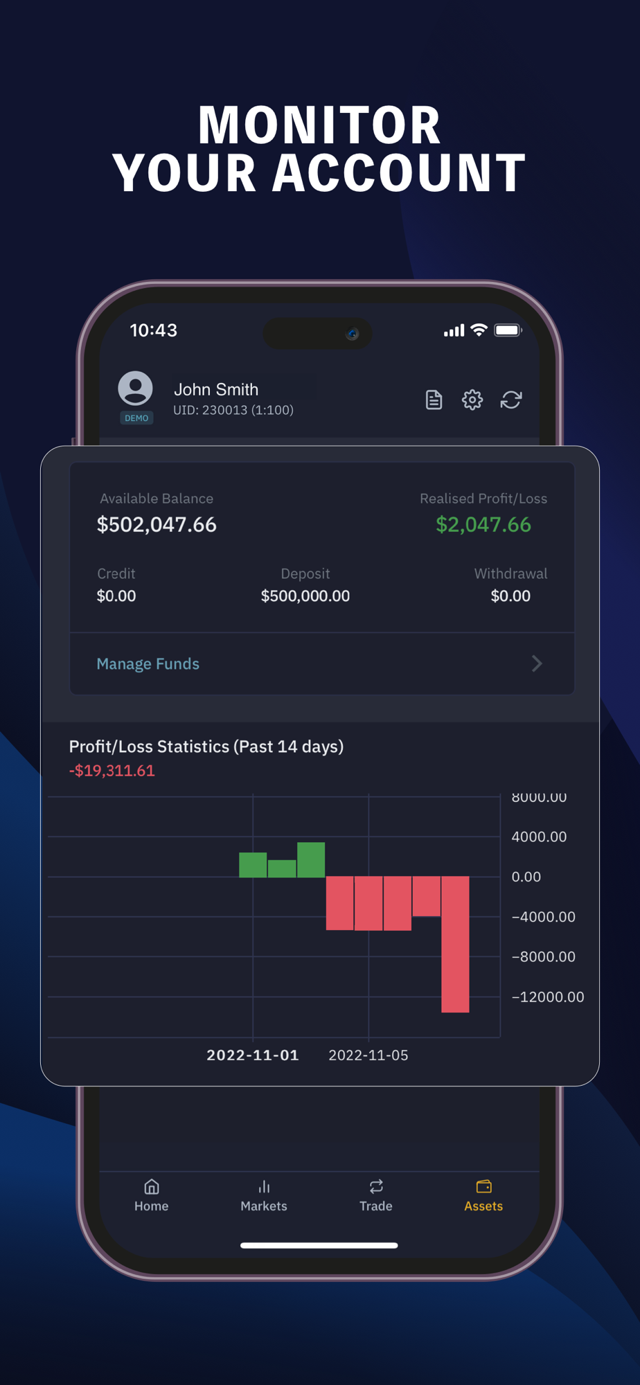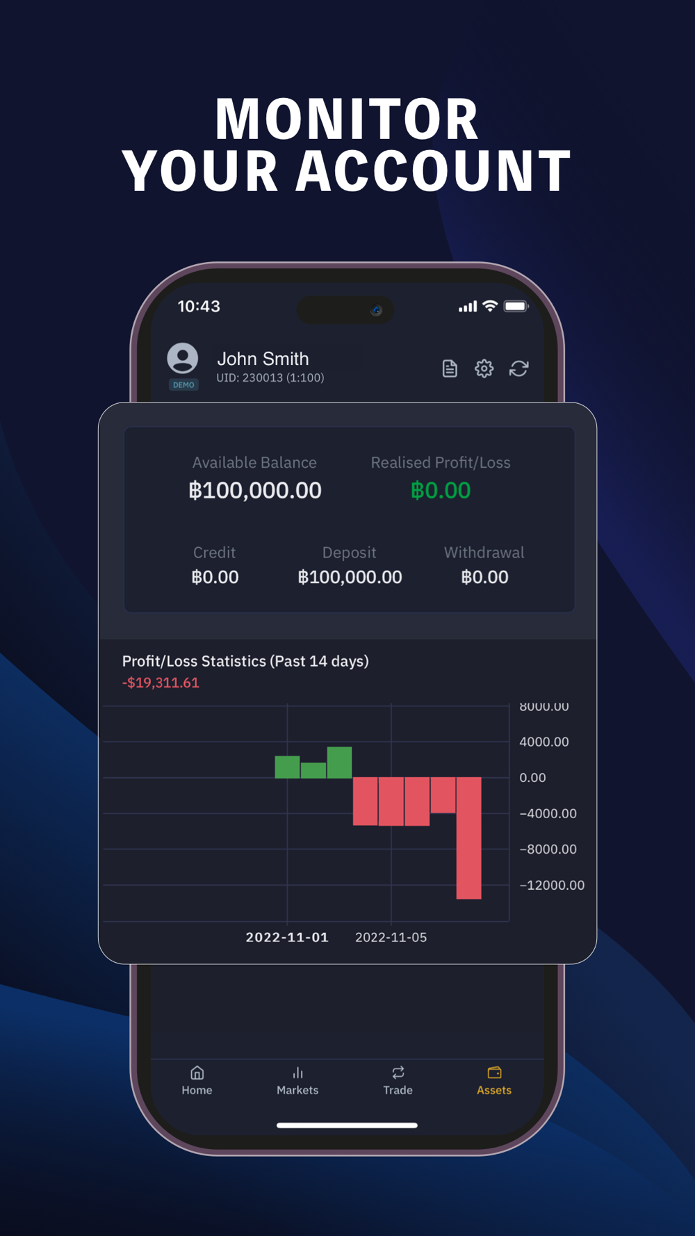 - Easy monitoring - funds, balance, equity, profit/loss, and margin at all times.