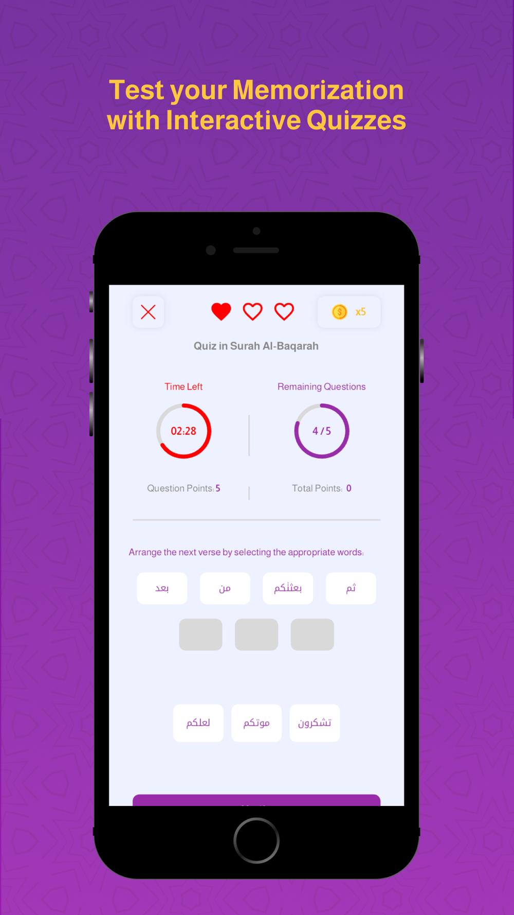* Verse Sequence Challenge: Test your Quranic knowledge by arranging verses in the correct order. Perfect for those aiming to master the sequence of Quranic verses.