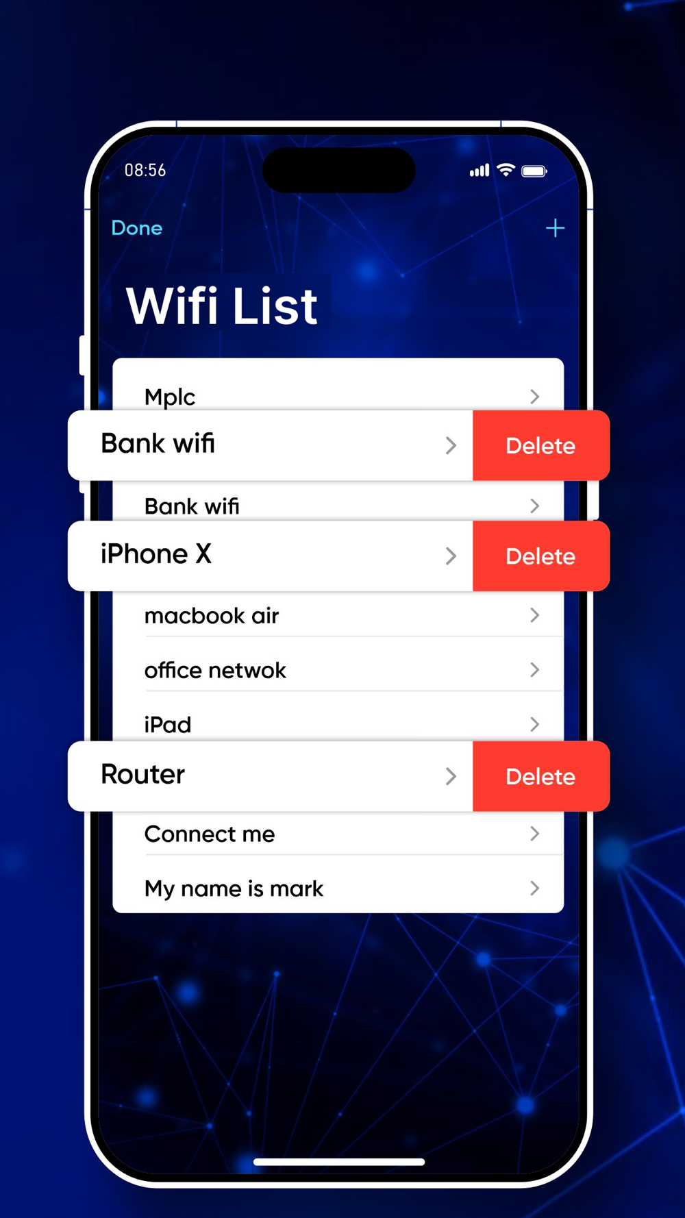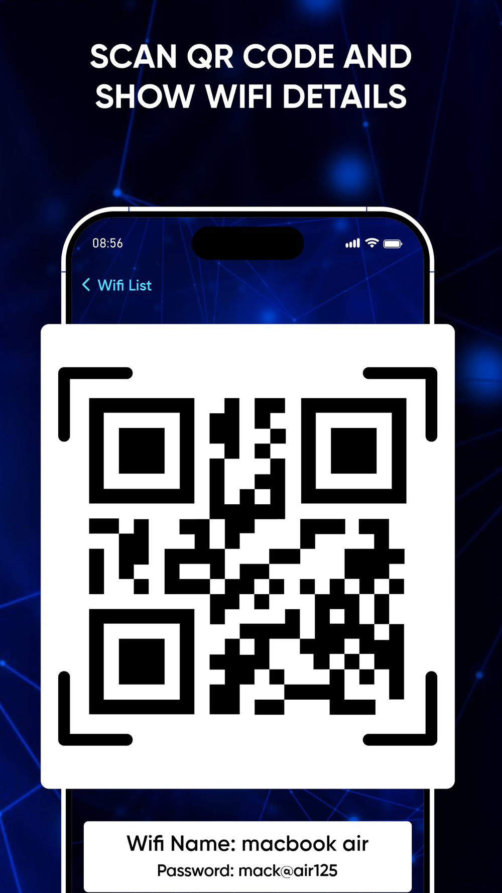 This app allows users to store information related to different WiFi networks. Each WiFi entry, consisting of a name and a password, is associated with a unique QR code for easy sharing and identification. The user-friendly interface, set against a calming blue backdrop, offers intuitive navigation and management of stored WiFi details