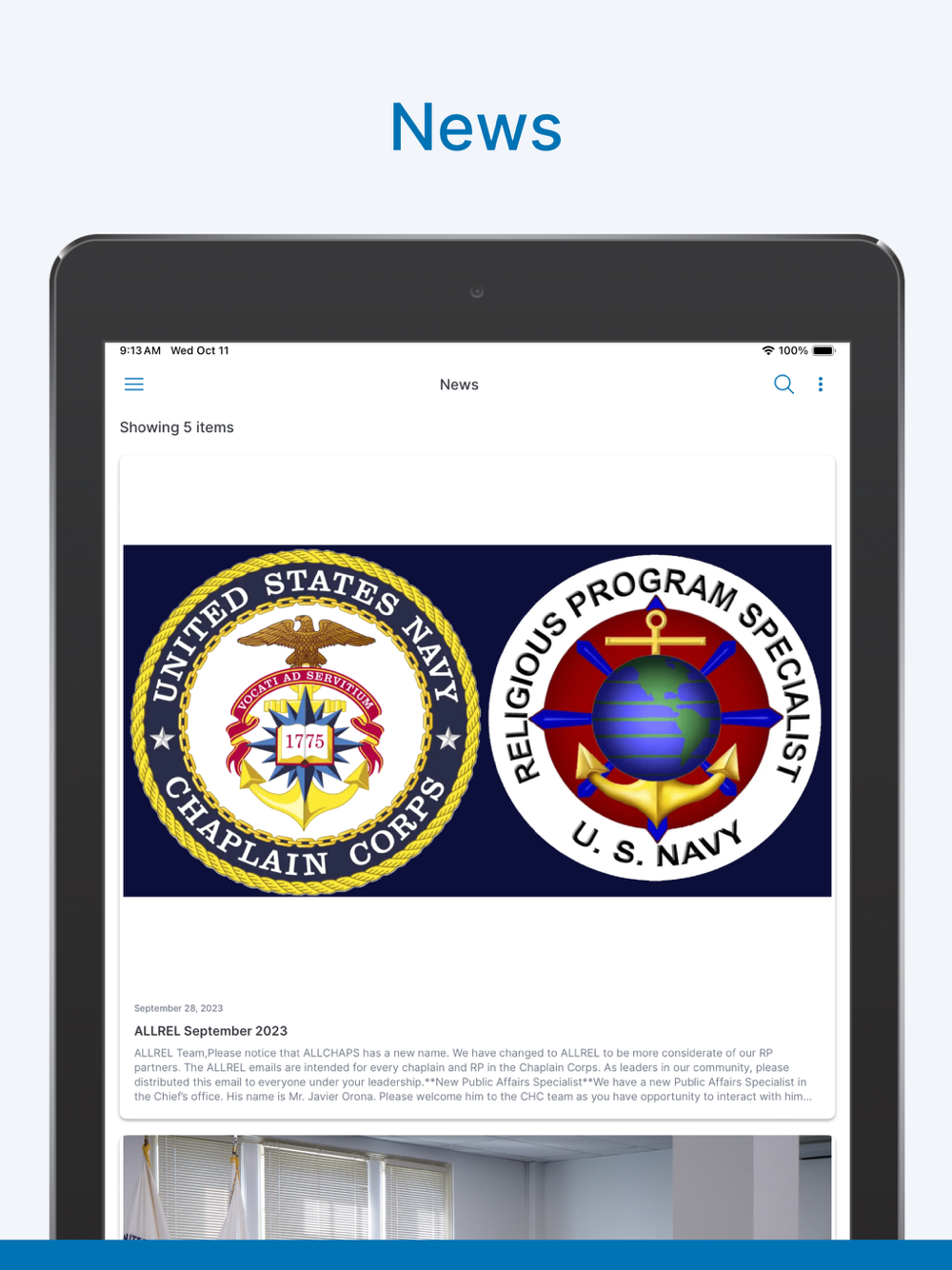 This app from the Naval Chaplaincy School (NCS) provides tremendous support and practical tools to all Navy Chaplains and Religious Program Specialists. Students taking classes through NCS can use it to receive communications from their class instructor, find resources, and provide feedback on their learning experience. All registered users can find a schedule of classes offered through NCS, curriculum-related materials, a library of ministry resources, the latest research conducted by the Communities of Interest, ALLREL messages providing up-to-date news from across the Chaplain Corps, important contact information, and much more to keep them informed, connected, and spiritually ready for any mission.