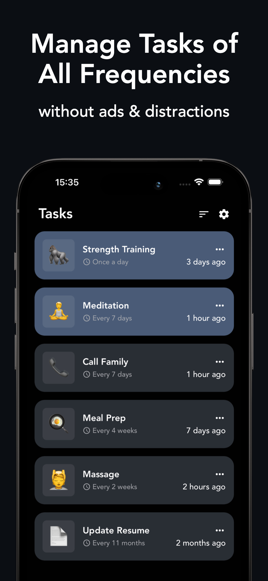 Tracking your daily tasks becomes a breeze with Reloop. Add routines like “water plants,” “call mom,” or “do pushups” seamlessly into your day. Our minimalistic yet powerful interface ensures easy management of your tasks, enabling you to maintain your focus and achieve your daily goals.
