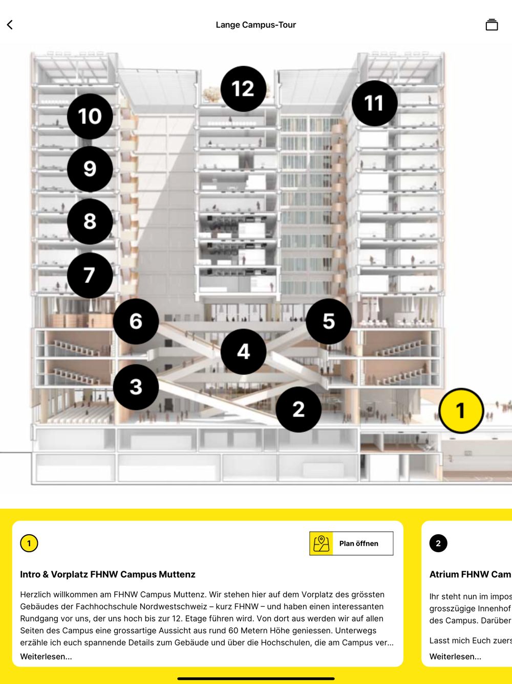 Der FHNW Campus Muttenz wurde im Herbst 2018 eröffnet und erfreut sich aufgrund seiner spektakulären Architektur eines anhaltend grossen Interesses von Besuchenden mit unterschiedlichem fachlichen Hintergrund. So treffen auch nach Jahren noch immer viele Anfragen für geführte Rundgänge bei den Campus Muttenz Services (CMUS) ein. Mit dieser Hörtour durch den FHNW Campus Muttenz, erhält man die Möglichkeit eine flexible Führung durch die öffentlichen Innenbereiche des Campus-Gebäudes zu erleben. Hier forschen, lehren und arbeiten fünf Hochschulen auf 16 Etagen und rund 61'000m2 Fläche.
