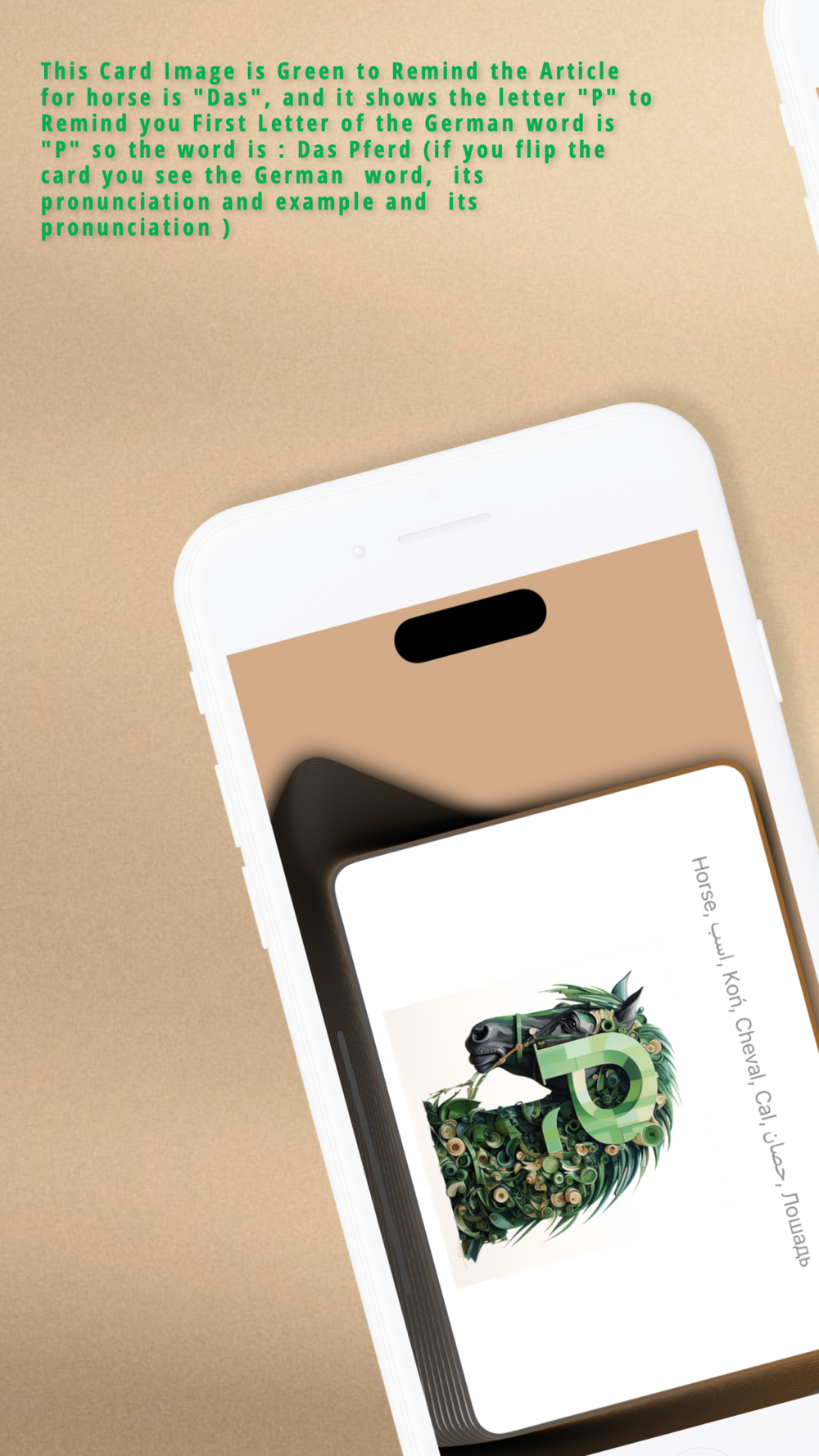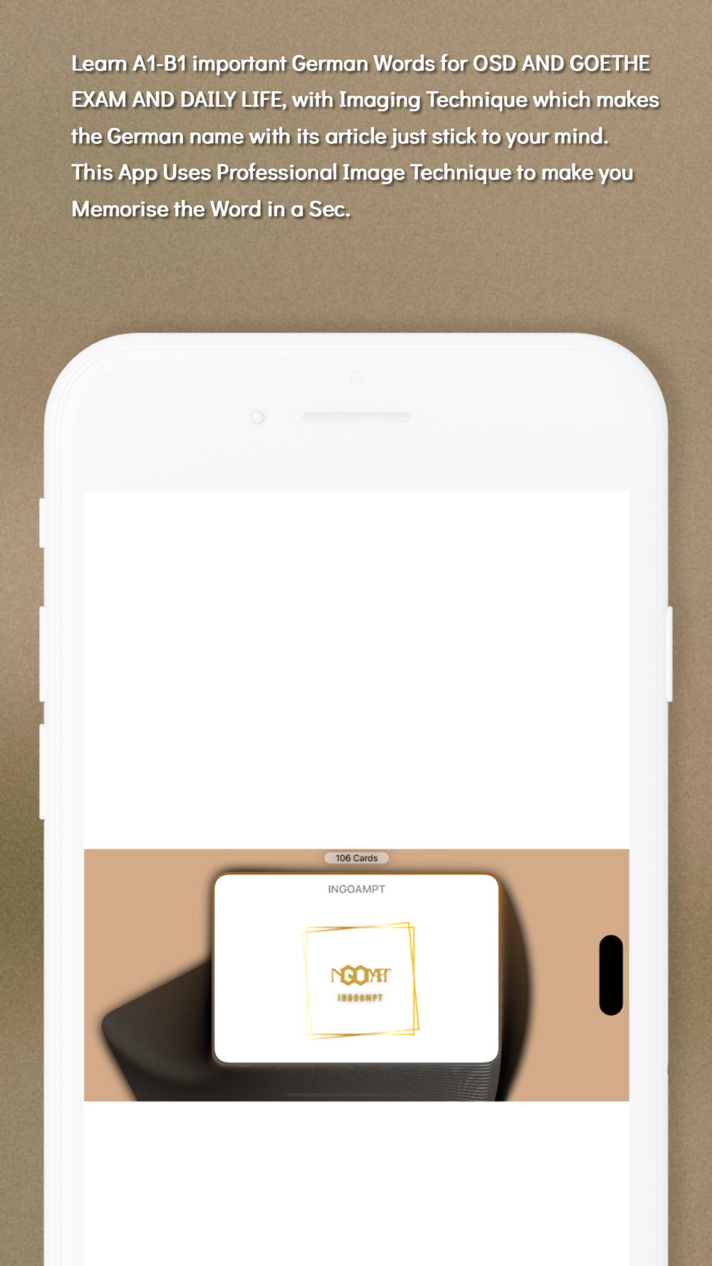 A picture is worth a thousand words. This application Uses Professional Imaging Technique to make you learn German Word Easier and faster. Because of the Imaging technique we used here the German Word and its article will stick to your Mind. The Images use 3 Colours of Pink, Blue and Green for the article "Die", "Der","Das" so we tried to create the image with the colour of its article so you the image makes you remember of the article. Also, on each Image the First Letter of the German Word is Shown so in future you can remember the word easier because images have a strong, enduring impact on our memory.