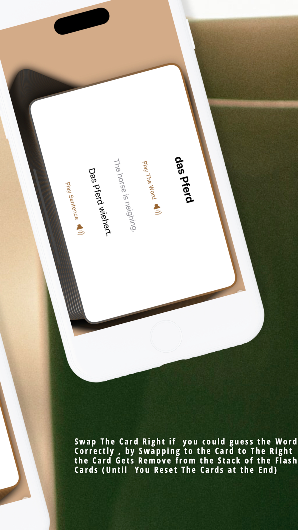 .Swap the Card Right(by drag gesturing to the right), if you Know the Word, so the Card gets repeated. You can Reset all The Cards Back at the End. (The Colour of the card turn green when you swap Right so you know your answer was right)