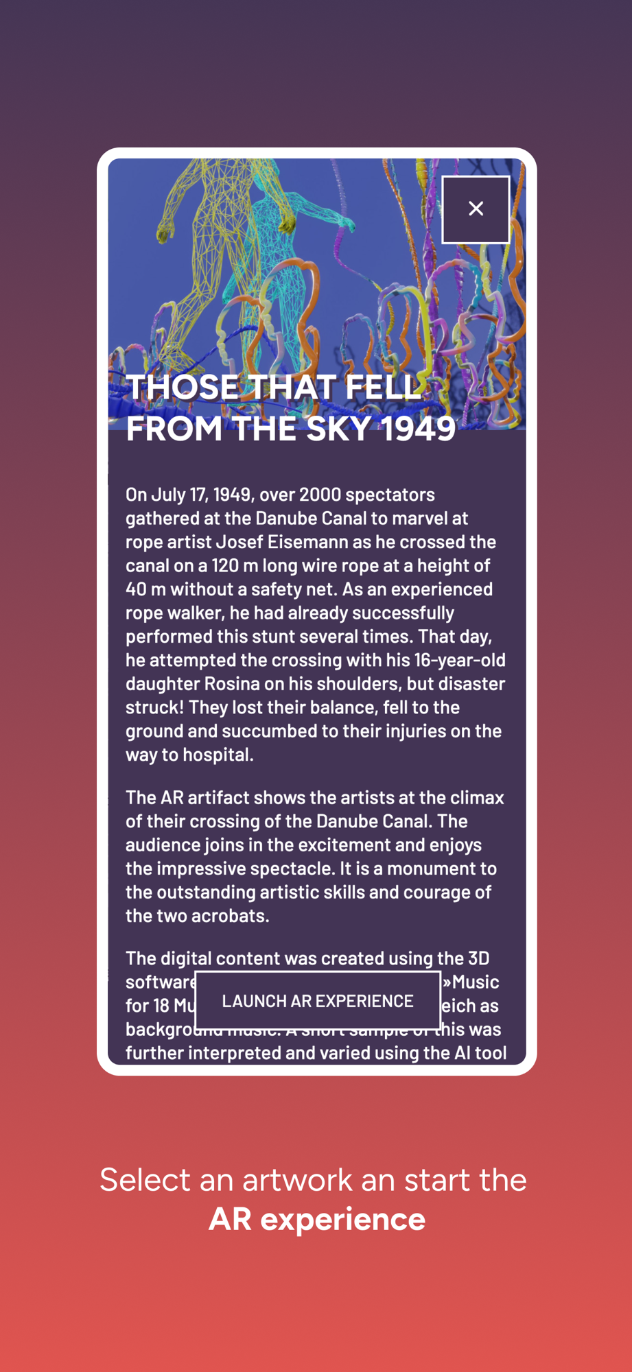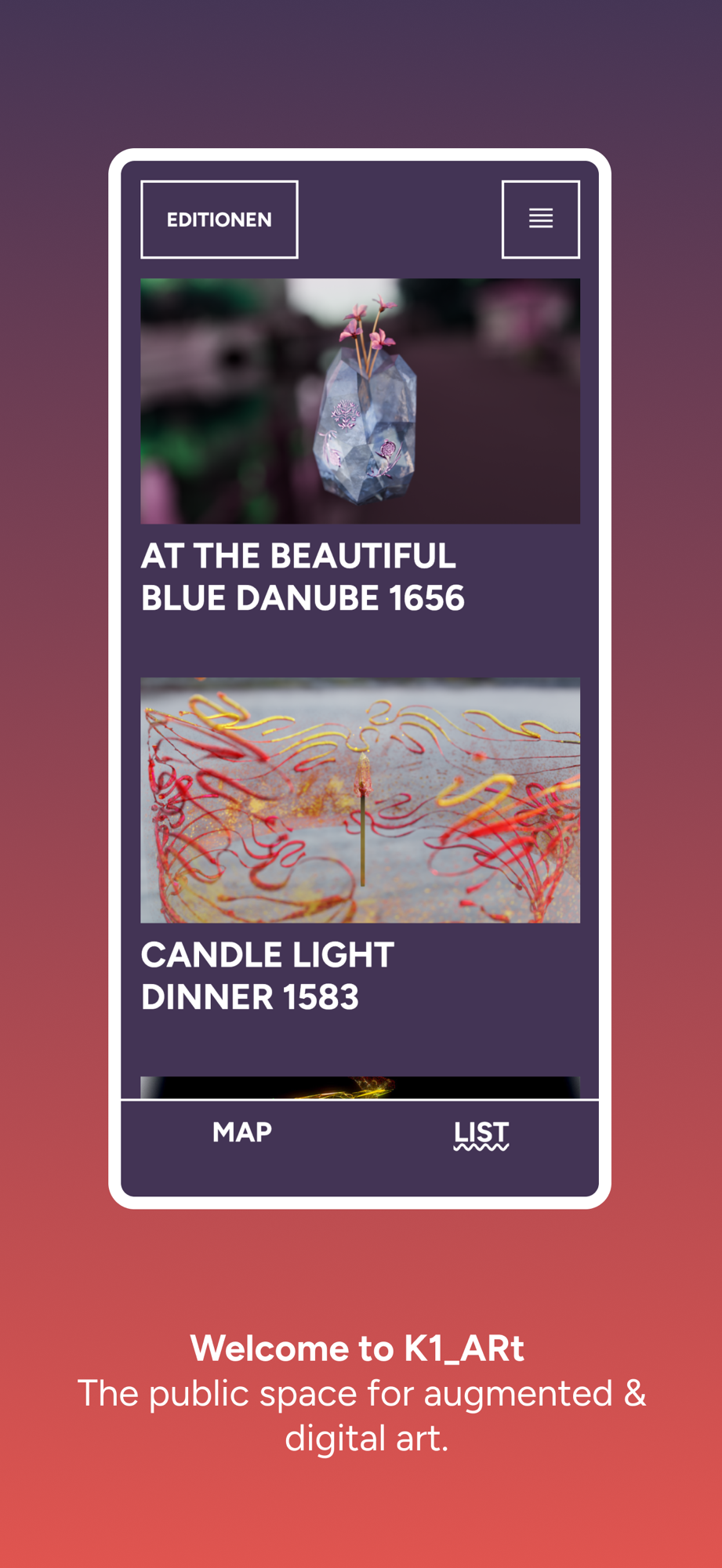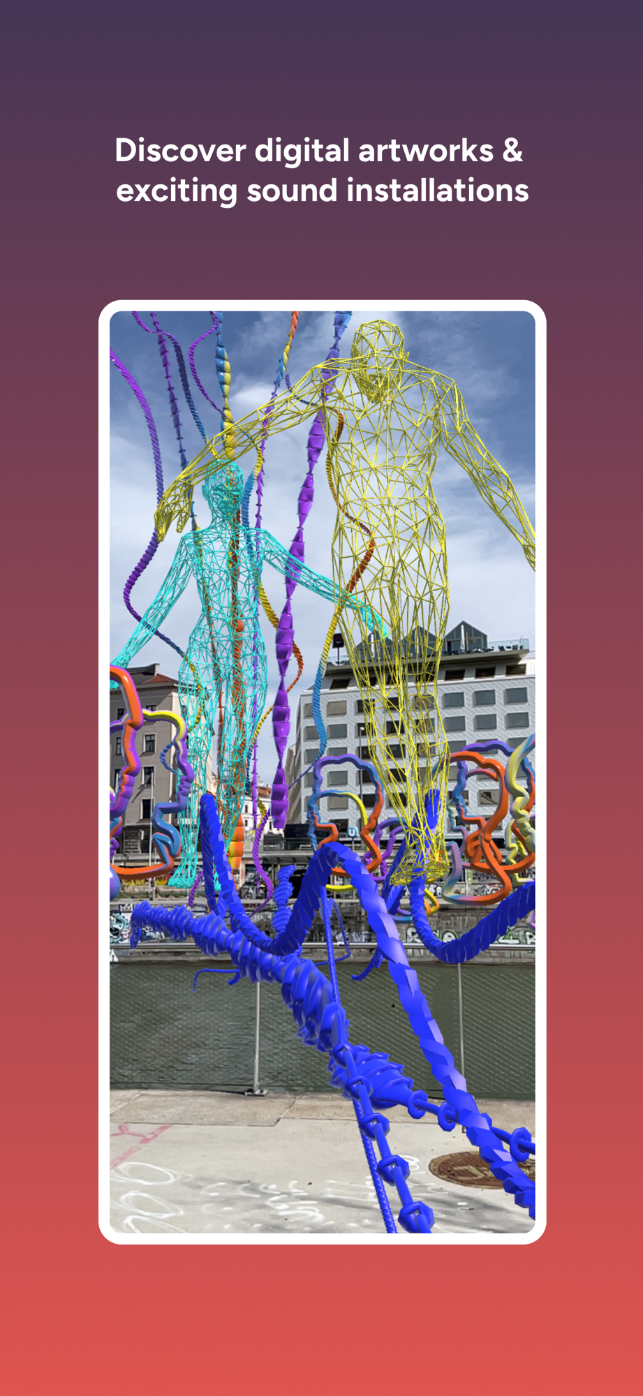 Mit der App kannst du über eine interaktive Karte deinen Standort ermitteln und Augmented-Reality-Kunstwerke an verschiedenen Orten entdecken. Die Werke verbinden 3D-Animationen mit vielstimmigen Sound-Formaten und laden dich ein, Kunst individuell und ortsspezifisch zu erleben.