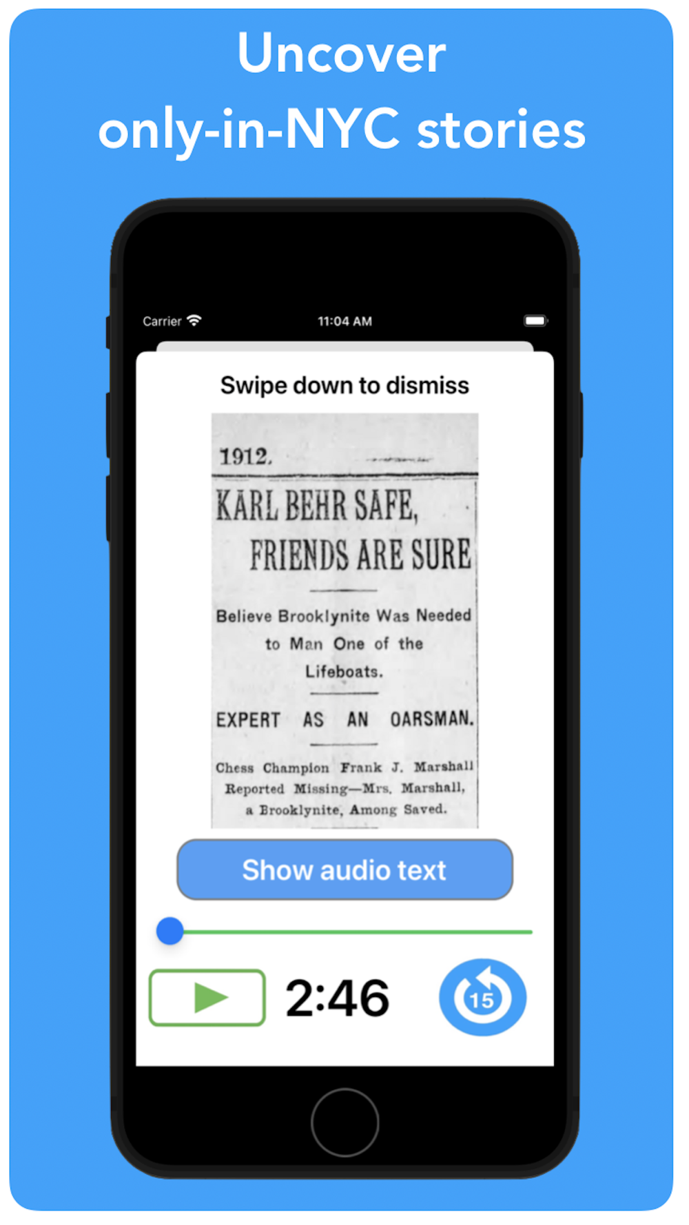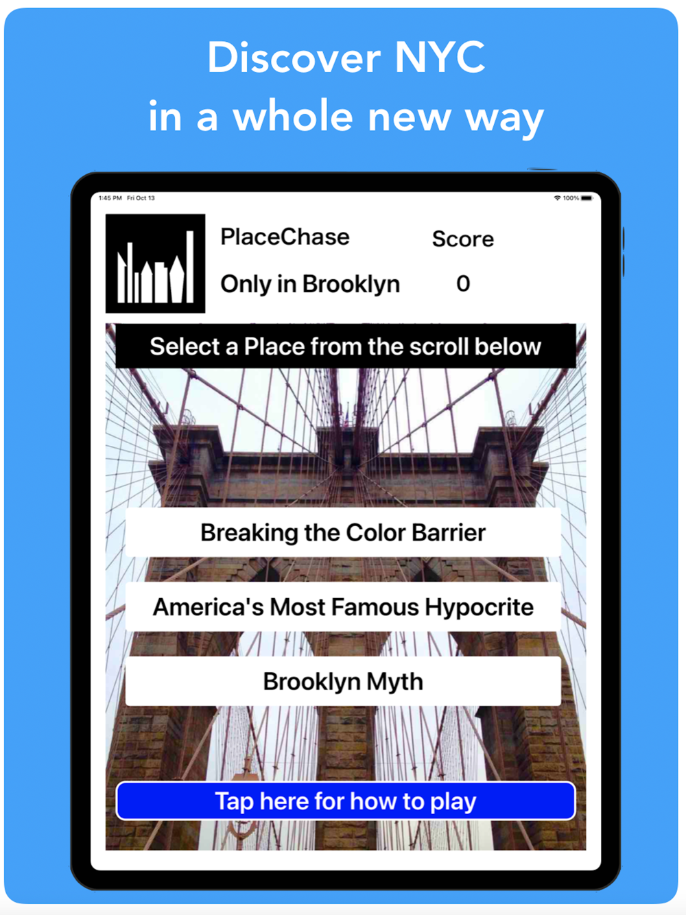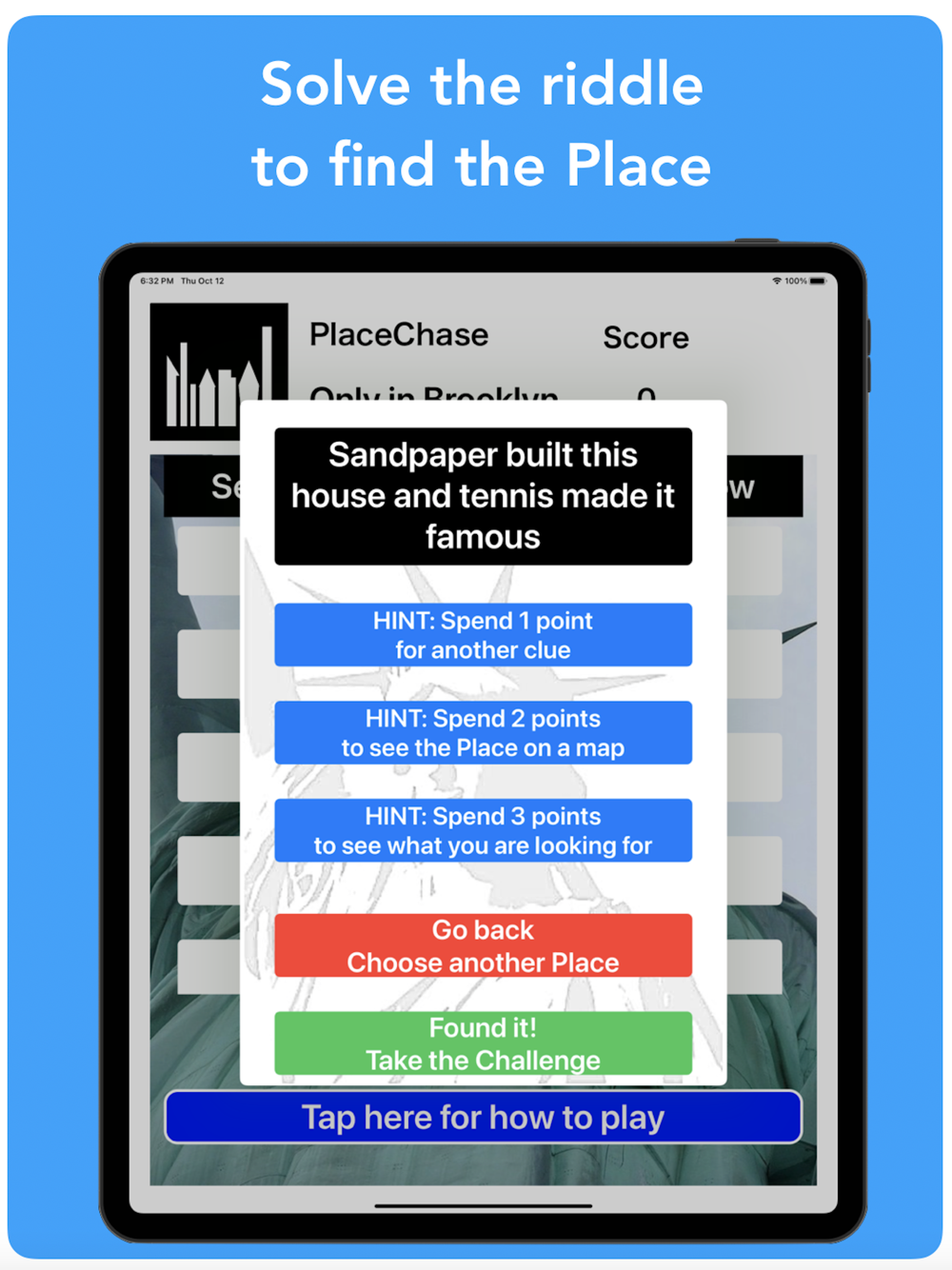 Experience the incredible history of Brooklyn as you solve ten riddles in any order you like to uncover unique Places and stories that could only happen in Brooklyn's. Each riddle leads you to a Place. Can’t find the Place, don’t worry — we give you hints, an image of what you’re looking for, even where it is on the map. But it will cost you points to get that help.