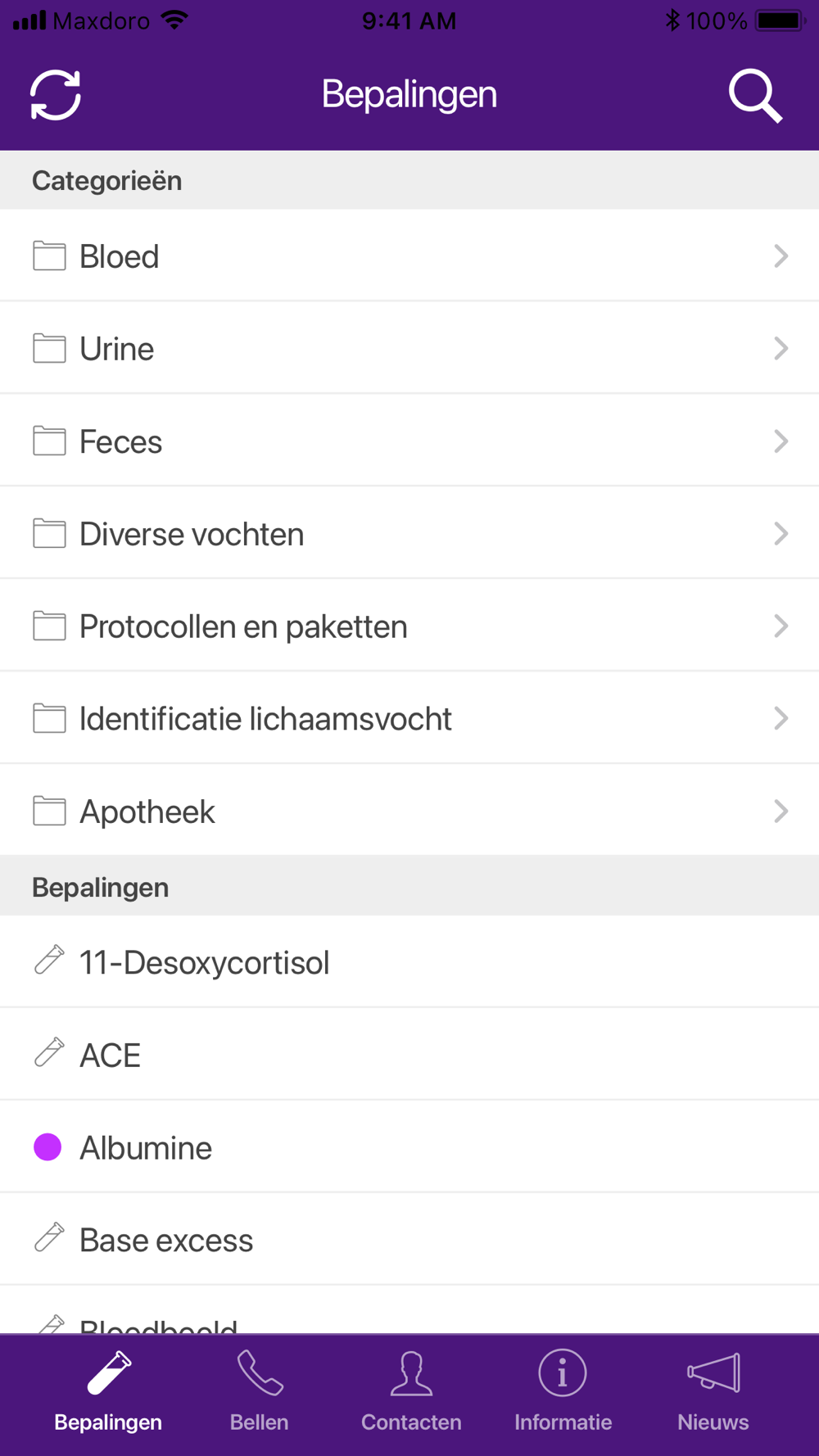 • Up-to-date referentiewaarden: Wanneer de app beschikt over een internetverbinding zal deze contact maken met een beheersysteem om de laatste referentiewaarden op te halen. Deze zijn via diverse categorieën eenvoudig bereikbaar. Een detailpagina kan tevens een afbeelding of een link naar bijvoorbeeld een PDF bestand bevatten.