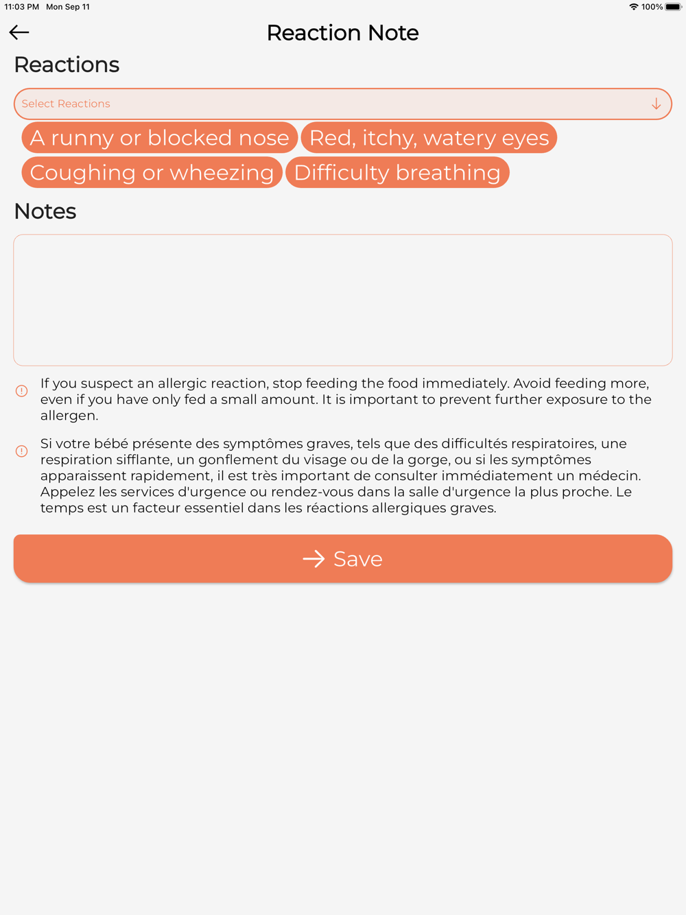 *Foods Tasted: Easily take note of the foods your baby has tasted and the reactions and sensitivities to those foods. You can also easily track the foods he likes or dislikes by adding reaction emojis.
