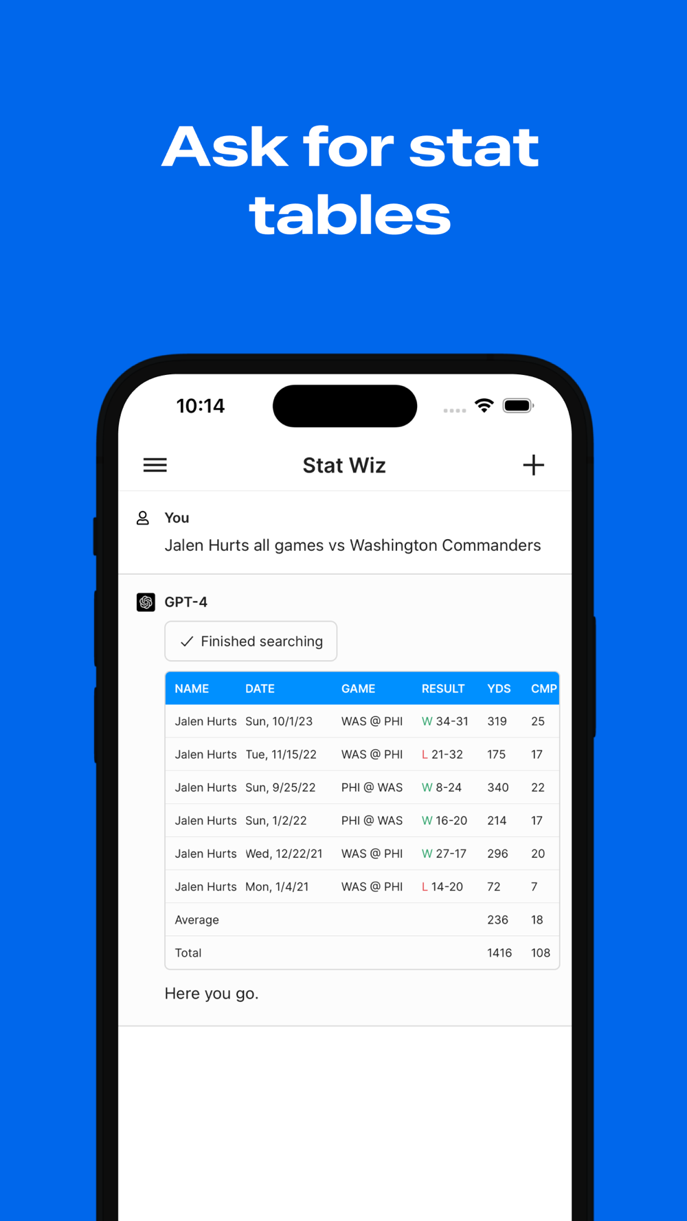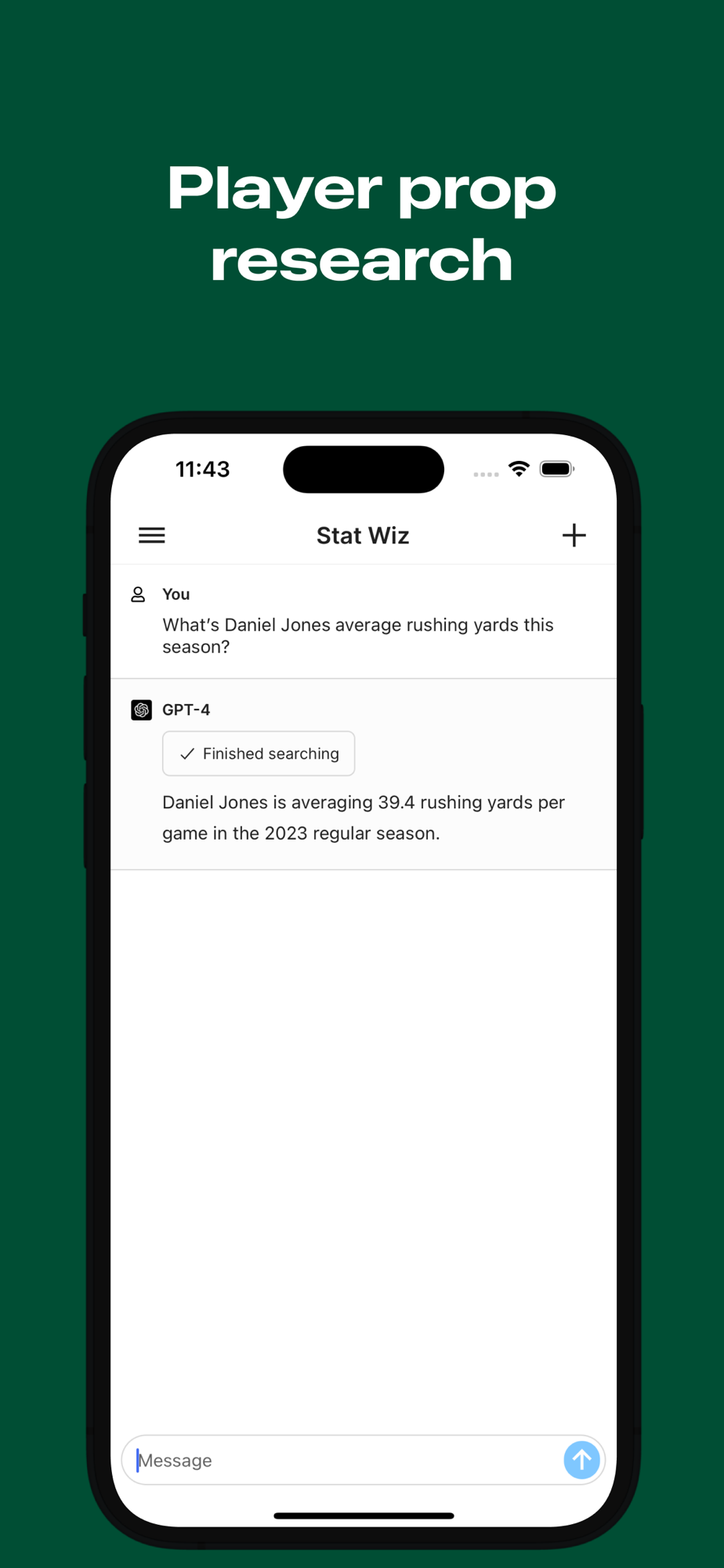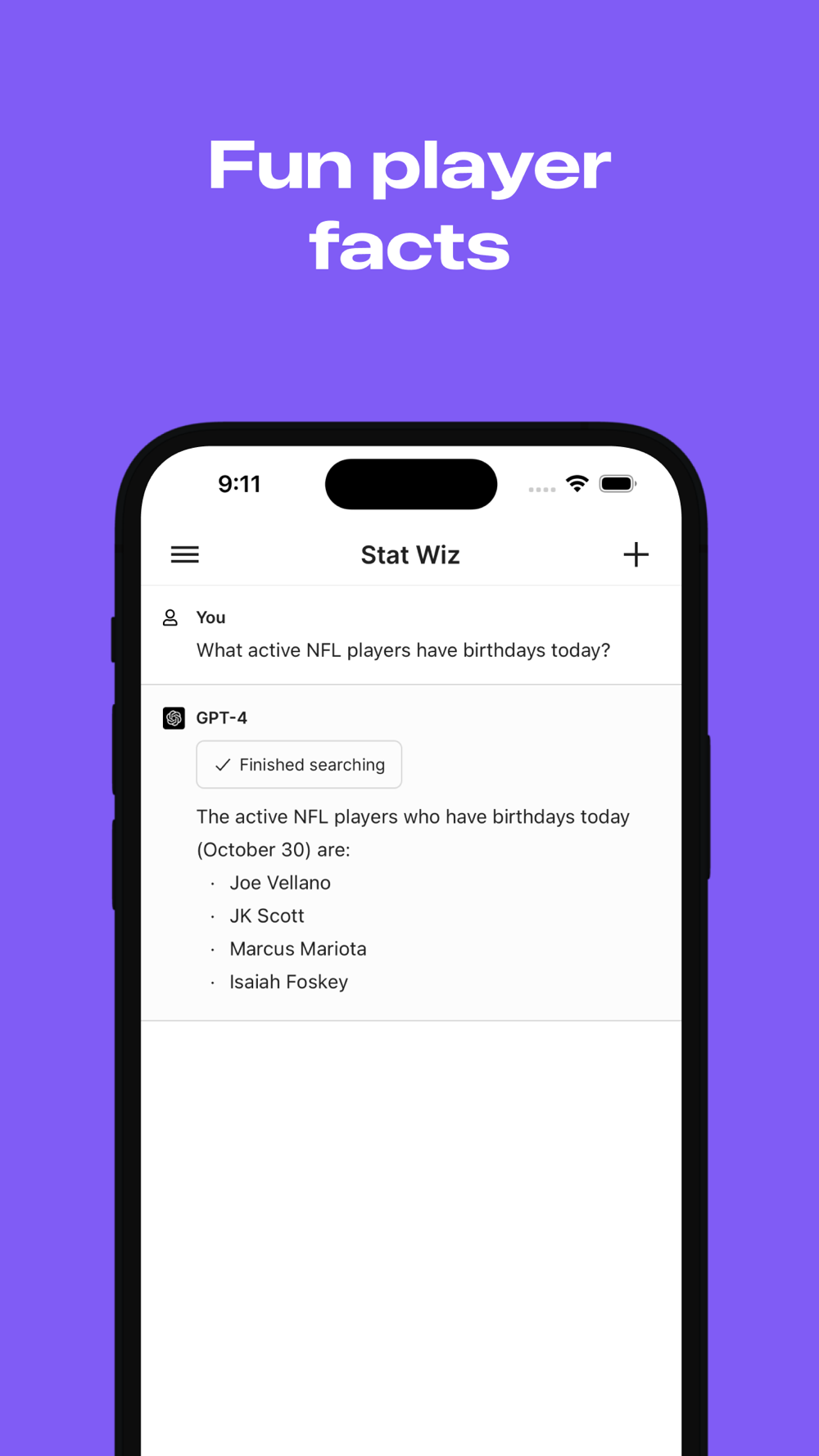 The most advanced AI sports chat bot. Ask any sports question and get an answer. Powered by ChatGPT API & GPT-4. Currently supports NFL, other sports coming soon.