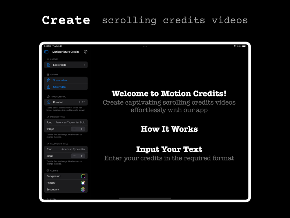 Whether you’re creating end credits for films, adding titles to a video project, or designing a custom outro, our app provides everything you need to make your videos stand out.
