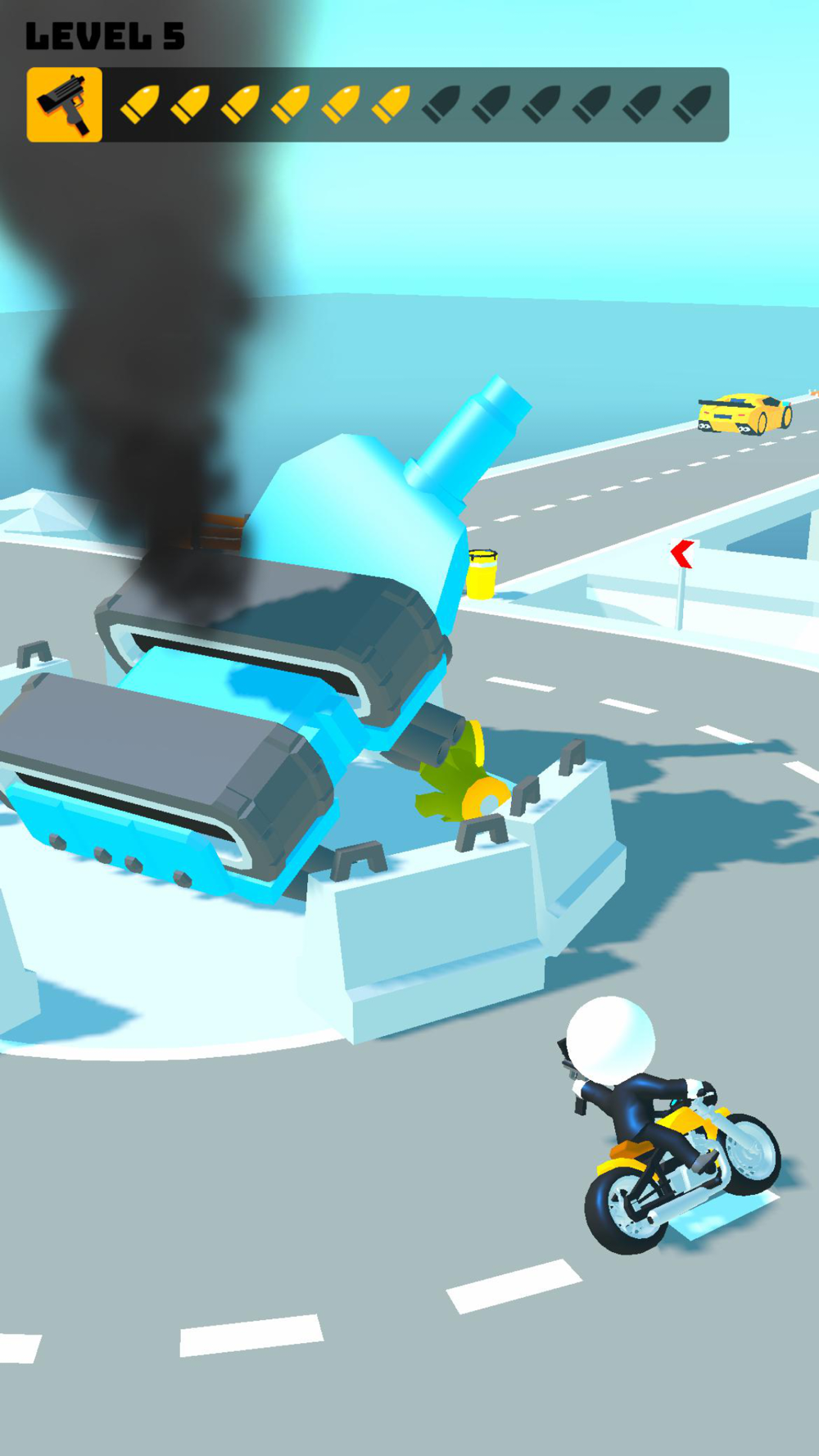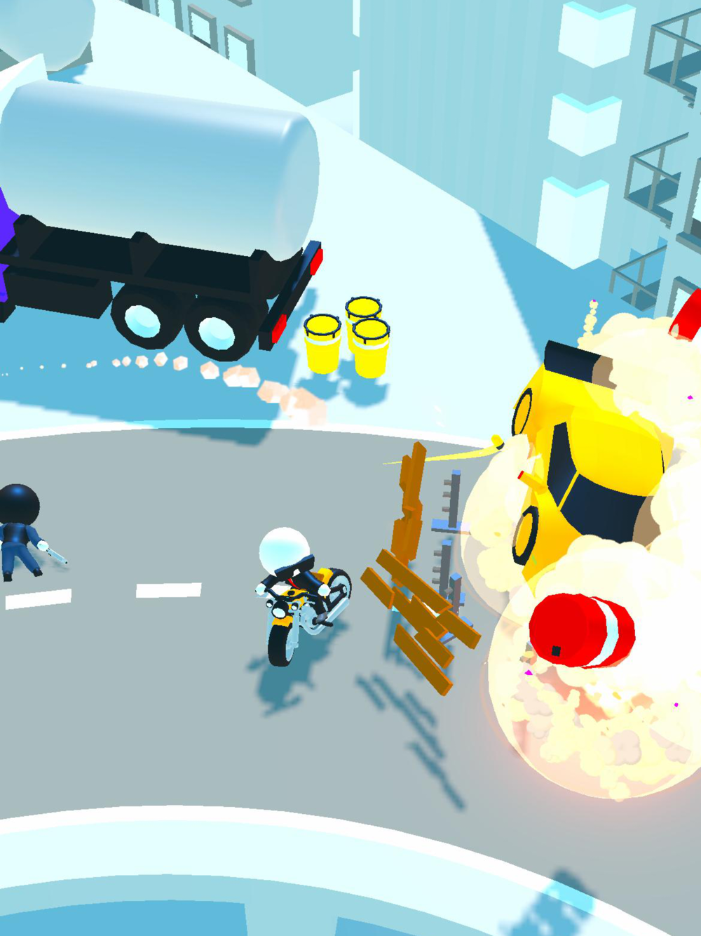 Travel through diverse locations, perform incredible stunts, and demolish all obstacles in your path. When facing enemies, enter slow-mo mode to aim precisely and take the crucial first shot.