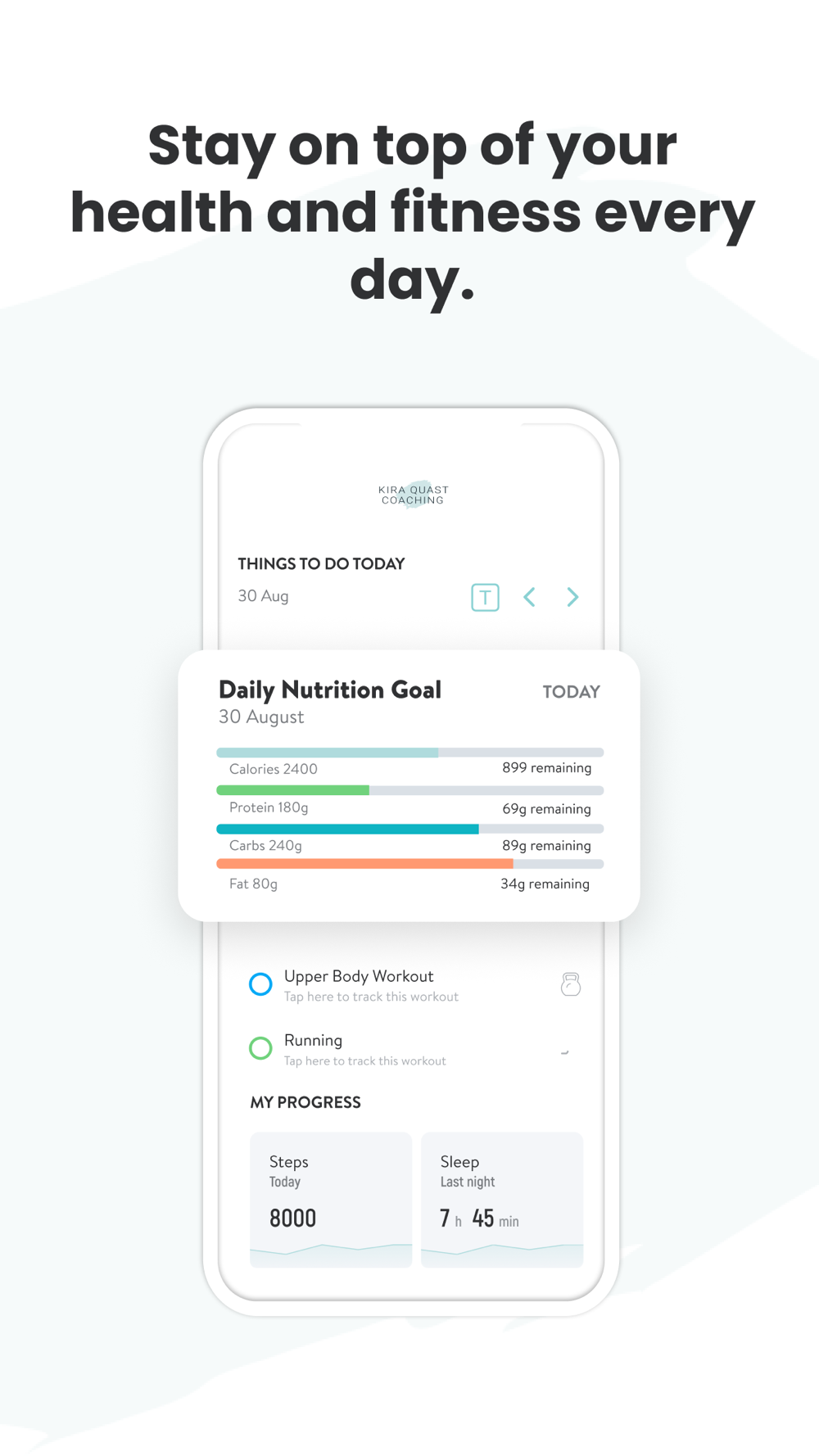 With the Kira Quast Coaching App, you will have access to professionally designed workout programs made specifically to help you reach your fitness and health goals! You can follow & track your workouts, your nutrition, your lifestyle habits, measurements and results–all with the help of your coach.