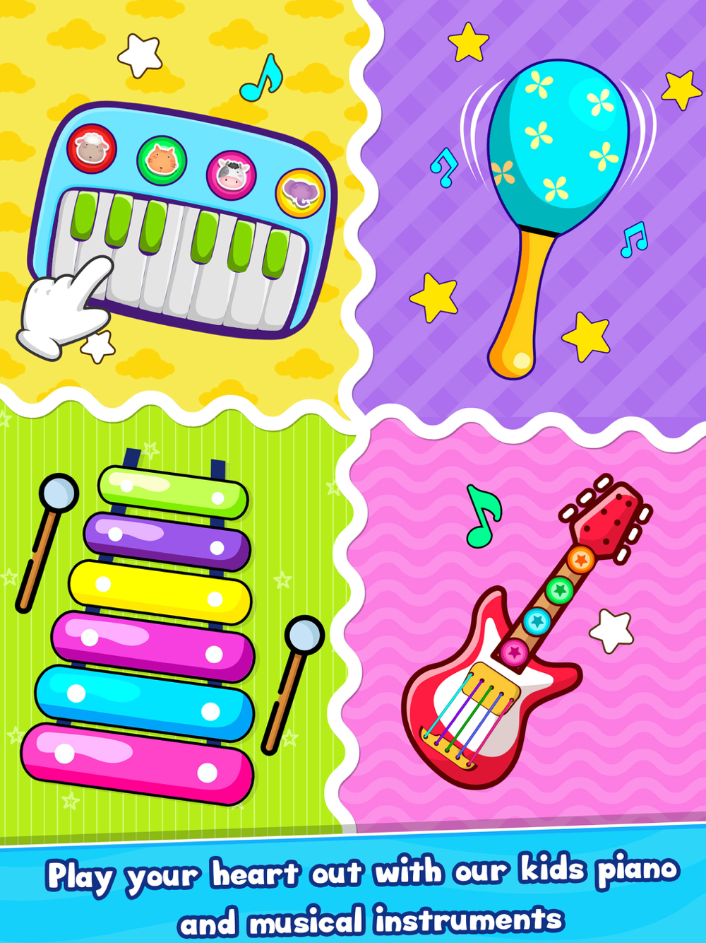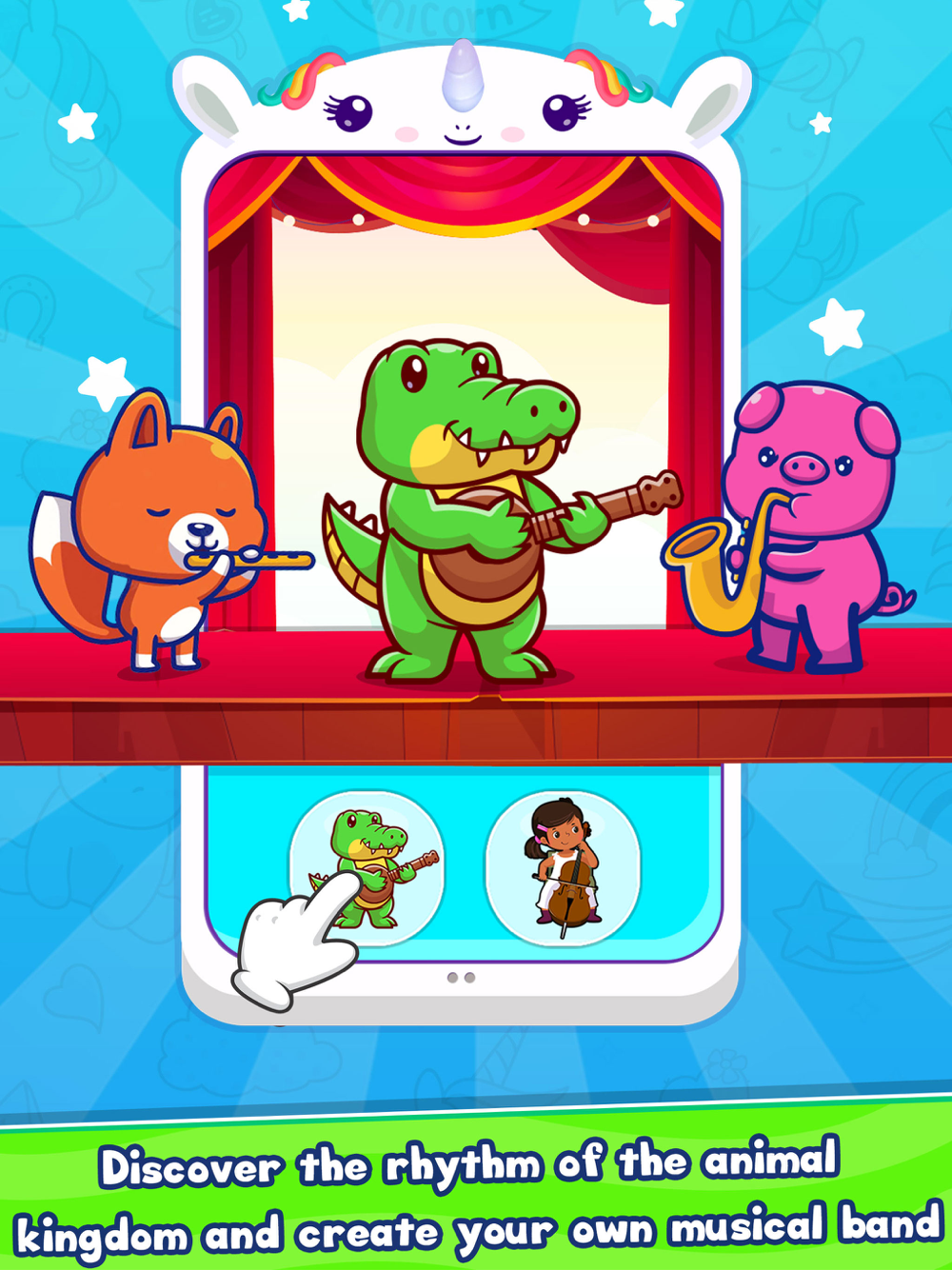 Explore the magical musical instruments and learn to play various instruments, from pink piano and guitar to drums and saxophone. Learn to create your own music.