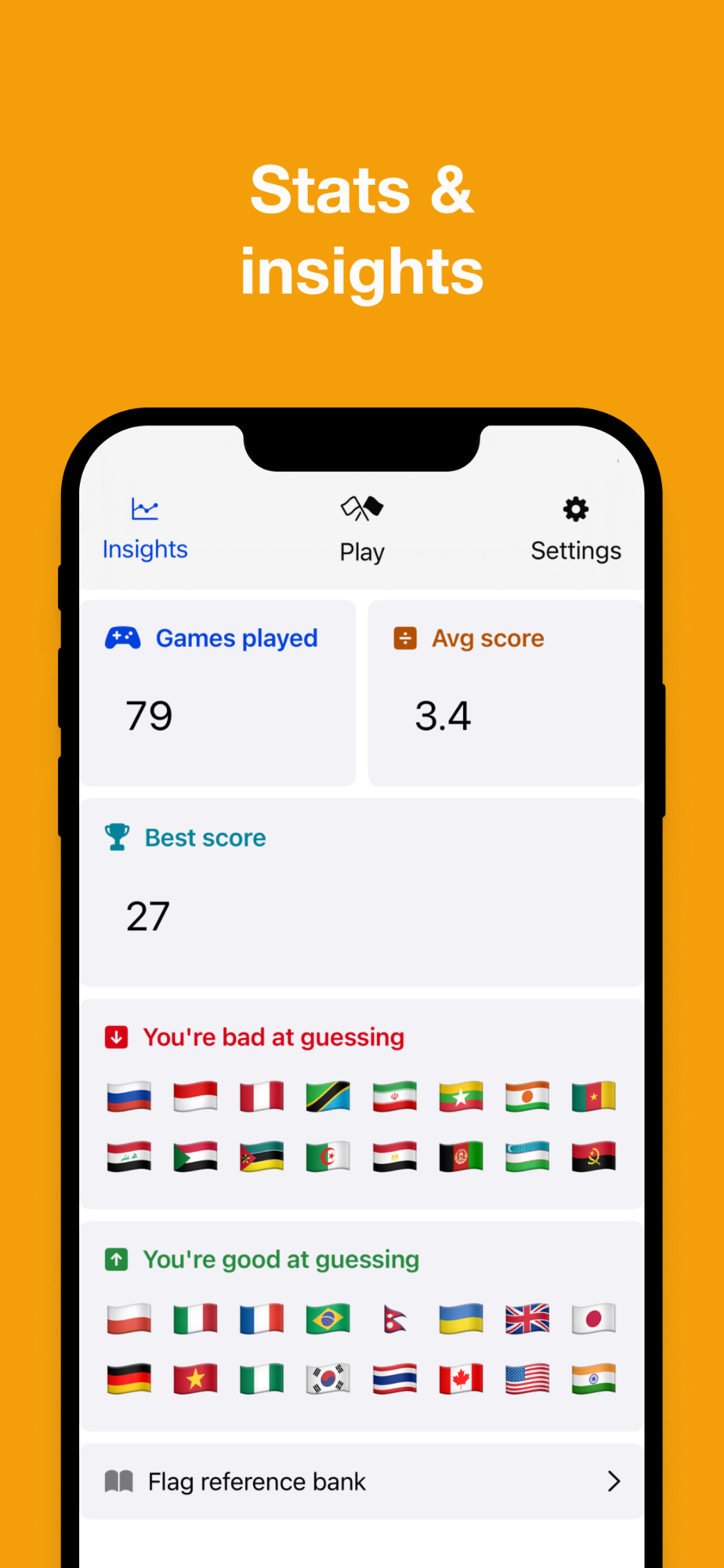 * Stats page with insights: Track your progress and improve your skills with our detailed stats page. Gain insights into your performance, accuracy, and flag knowledge over time.
