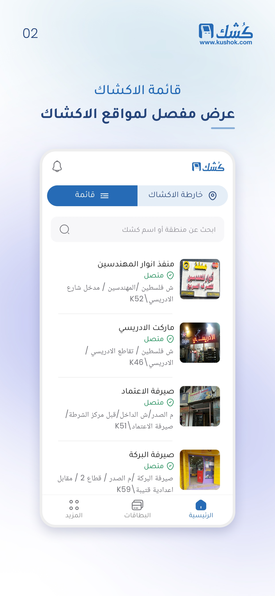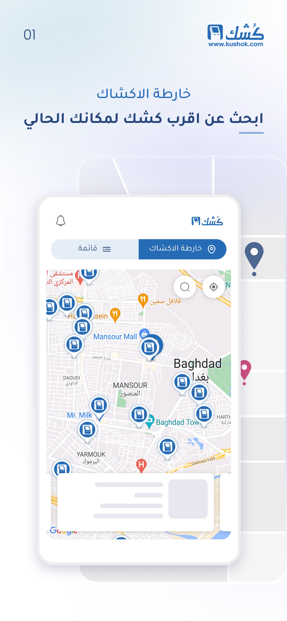 تحتاج خدمة من جهاز كشك ومحتار وين تروح؟ تطبيق خرائط كشك يسهلك ايجاد اقرب جهاز كشك لمكانك الحالي وممكن ايضا تعرف ان كان الجهاز في الخدمة ام متوقف قبل ما تتعب وتروح للمكان. التطبيق ايضا يعرض قائمة بالخدمات الي يوفرهه جهاز كشك. كذالك ممكن ان تستقبل التنبيهات لأعلامك عند توفر خدمات جديدة او لما ينزل جهاز جديد بمنطقتك. كل هذا من خلال تطبيق سهل ومريح جدا. نزل التطبيق واكتشف اكثر عن كشك !