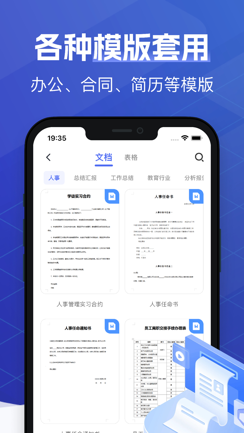 多类模板场景。合同协议、日常统计、办公常用、工作总结等模板一键套用。