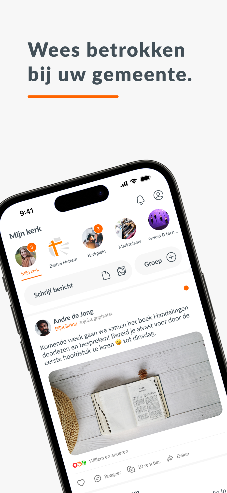 Dankzij onze unieke groepenstructuur helpen wij kerken beter te communiceren. Met de hele gemeenschap, maar ook onderling. U kunt zelf groepen toevoegen en mensen daarvoor uitnodigen. Een slimme timeline zorgt er voor dat iedere gebruiker persoonlijke en relevante informatie ziet.