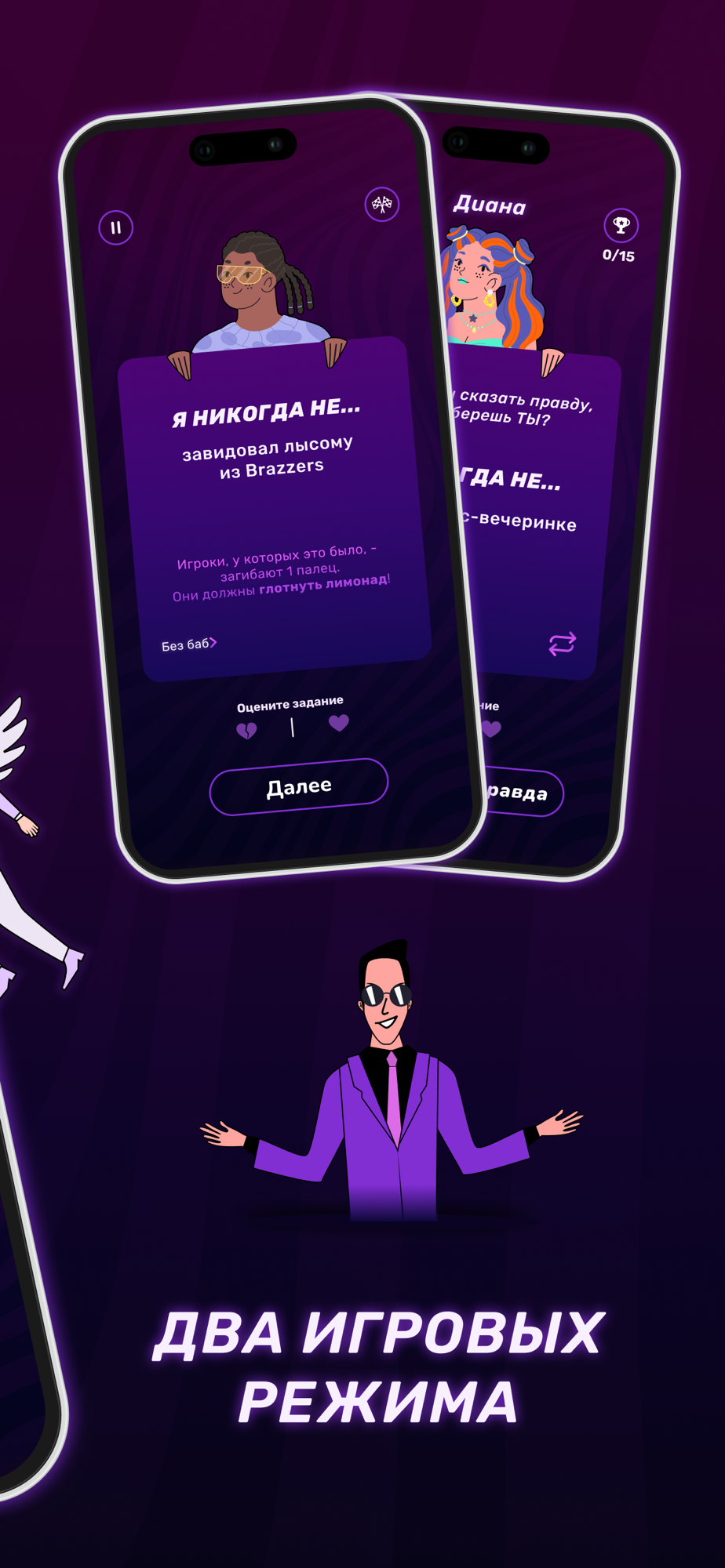 Чтобы вечеринка прошла максимально комфортно для вас, мы предлагаем настроить игровой процесс под себя. У вас есть возможность ввести наказание для проигравшего игрока и задать ключевое действие (его выполняют те игроки, у которых хоть раз была описываемая на карточке ситуация, например: «Снять предмет одежды» - это ключевое действие). Ну вы поняли, в нашей игре условия ставите ВЫ! А если вам лень или ничего не приходит в голову, можете выбрать из вариантов, которые предложит вам игра, нажав на кубик.
