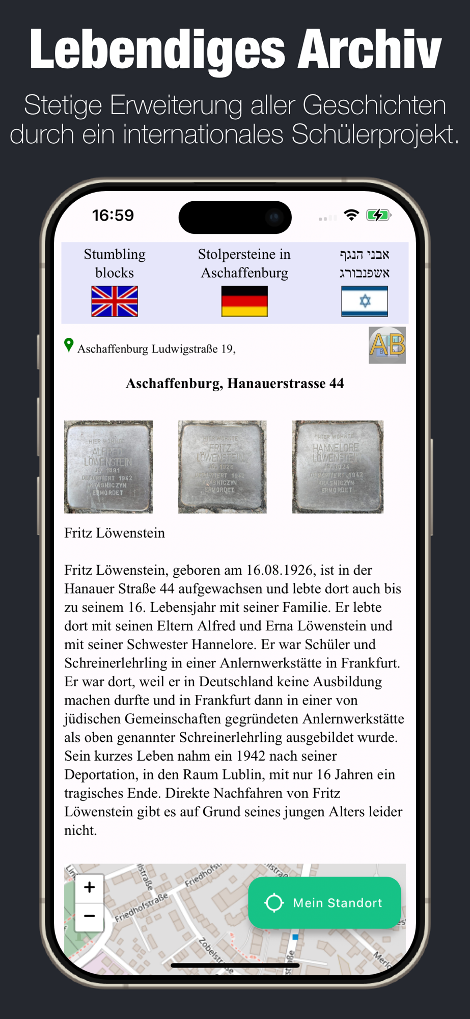 Since 2014 Yitzak Rabbin Highschool in Israel and Karl-Theodor-v.-Dalberg-Gymnasium in Germany have been working together for a common goal: To convey the personal histories of Holocaust victims to the public. In order to commemorate the victims of the Holocaust, the students research and write the biographies of Jewish citizens of Aschaffenburg, who were murdered in the Holocaust. Those biographies can be viewed with this app. By working in archives the German students collect information about the “persons behind the stumbling blocks“ that are installed in Aschaffenburg. The biographies are then translated by Israelis students into Hebrew. The texts are available in German, English and Hebrew.