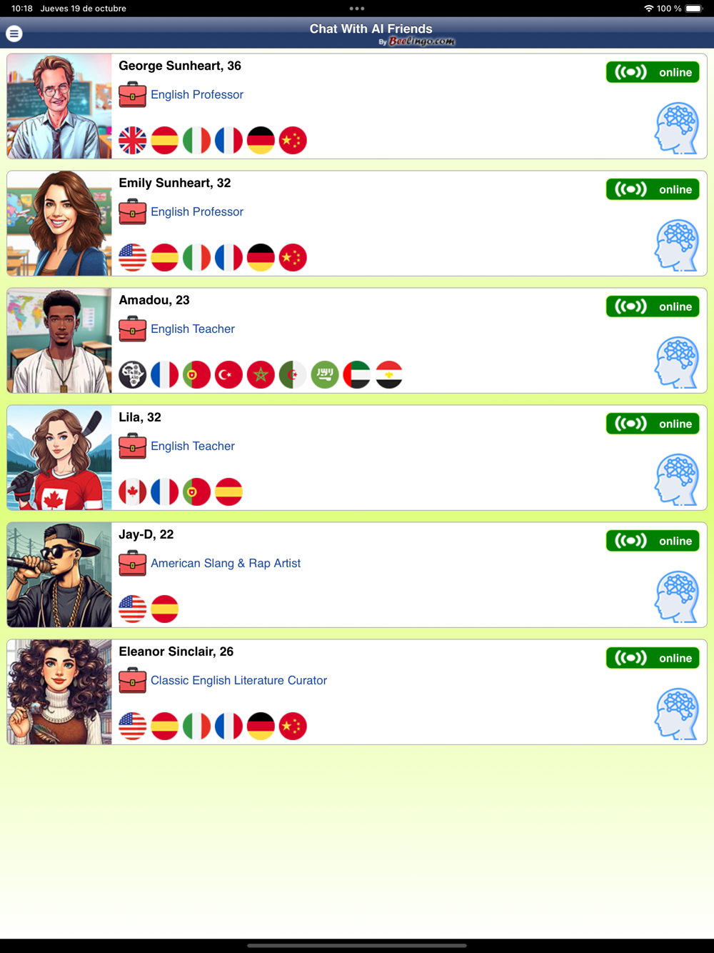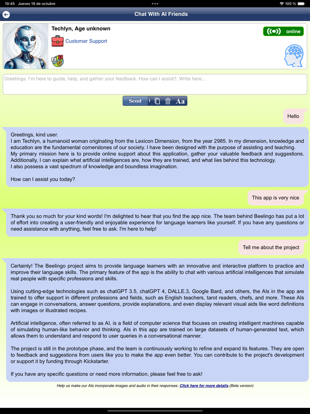 "Beelingo - Chat With AI Friends" is not just another chat platform. It's a profound and transformative linguistic experience that allows you to dive into genuine conversations with vibrant personalities from around the world. From chatting with a British novelist in his London study to uncovering the secrets of the constellations with an Australian astronomer, this innovative chat takes you on a journey through language and culture.