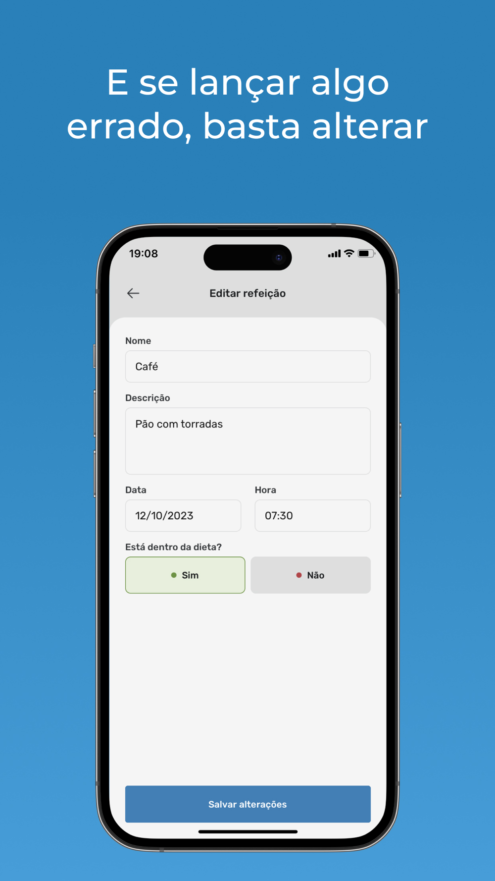 Com ele você faz o registro das suas refeições, informando data, horário, o que comeu e se estava de acordo ou não com a sua dieta. Sim, isso mesmo, você é responsável por informar ao app o que faz parte da sua dieta ou não.