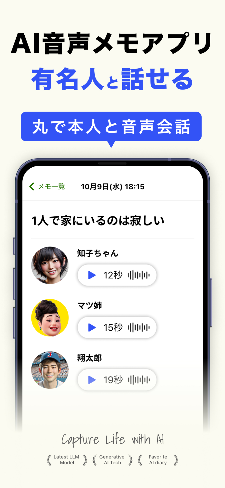 AI技術を使って有名人とリアルタイムで会話できる音声メモアプリ。悩みや楽しみを有名人と相談し、アドバイスをもらったり、ストレスを解消したり、過去の気持ちを振り返ることができます。