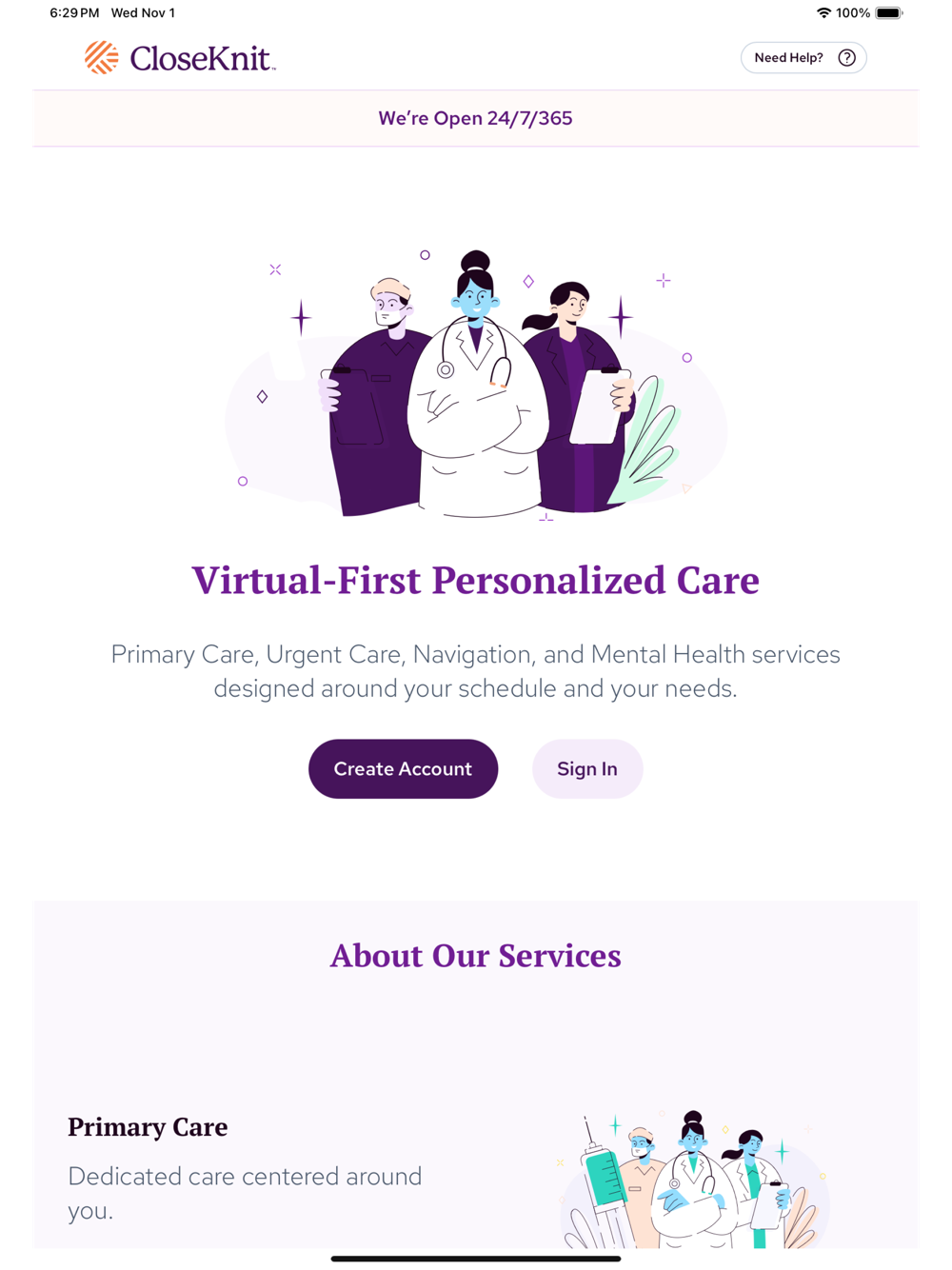 CloseKnit offers virtual-first care centered around you. Whether you need to treat illnesses and injuries - FAST - or looking for mental health support, we’re here to help.