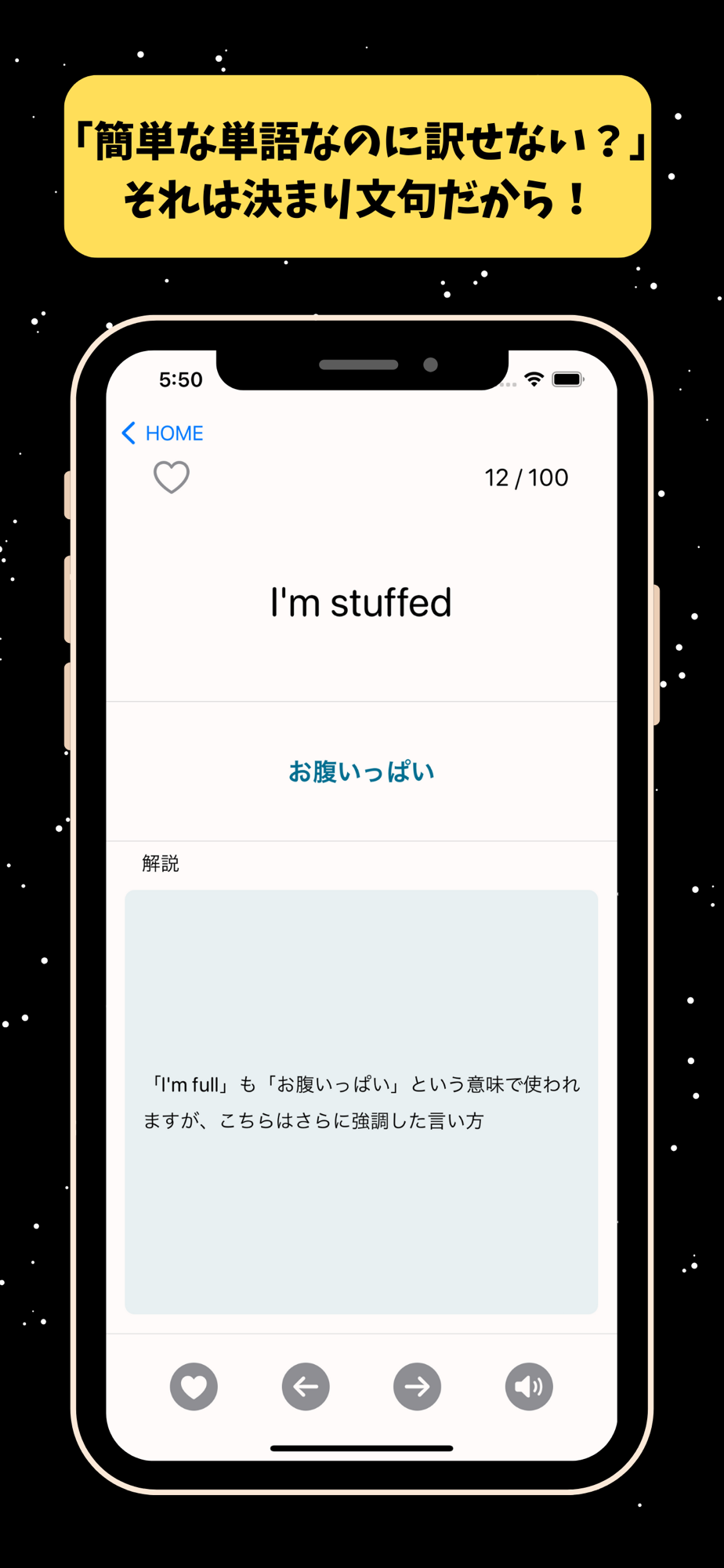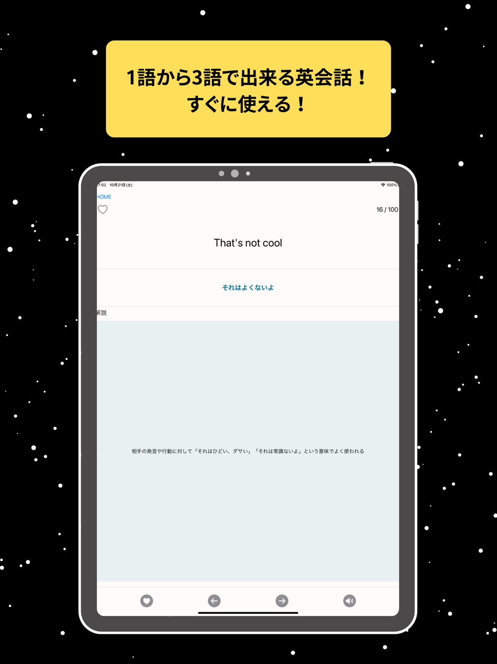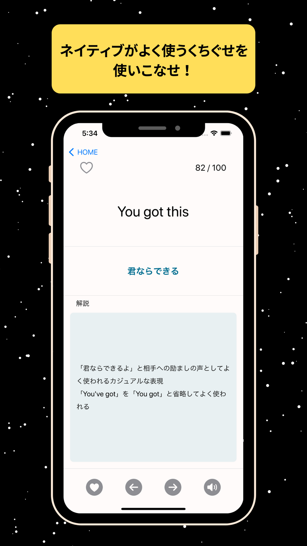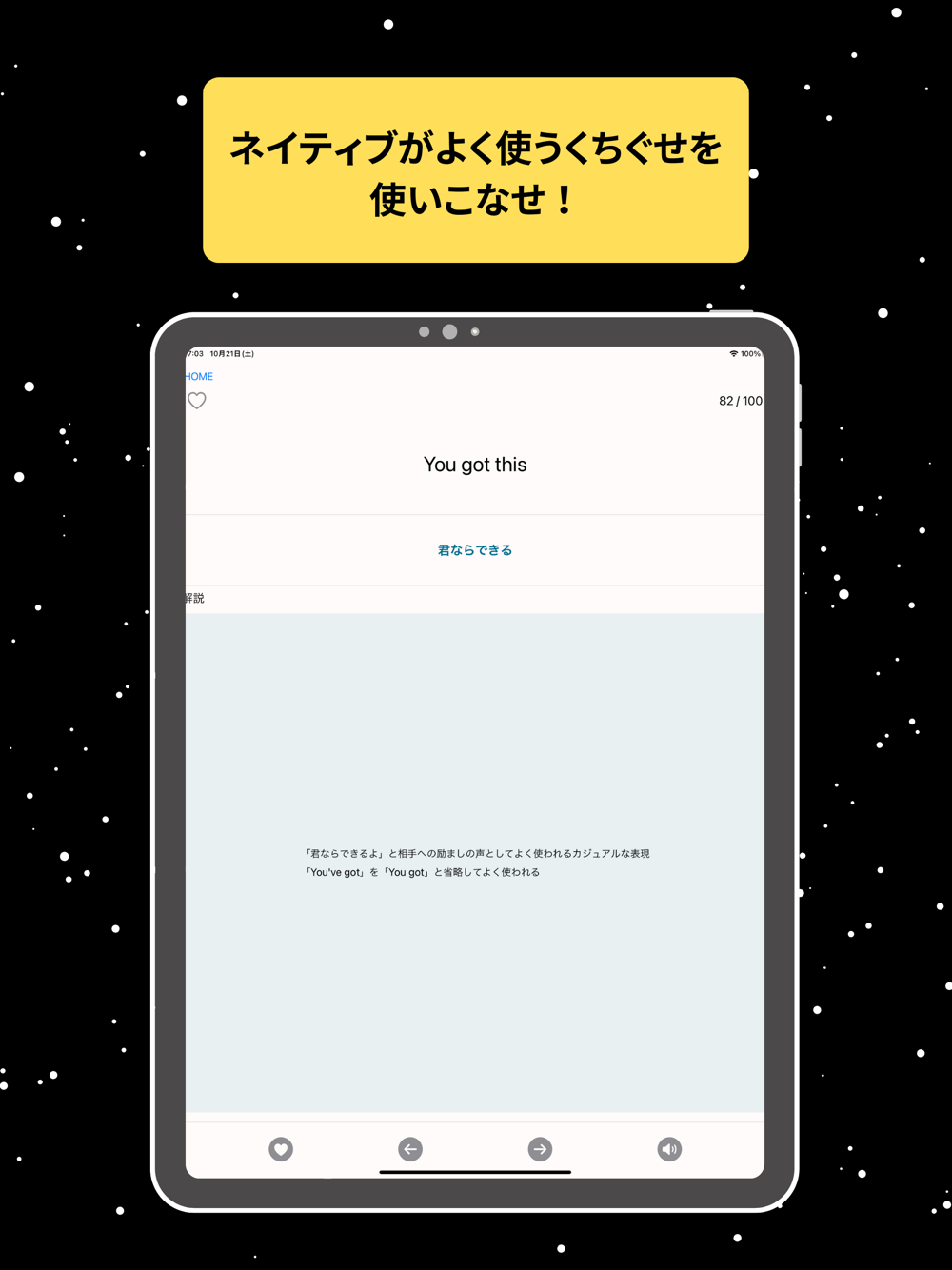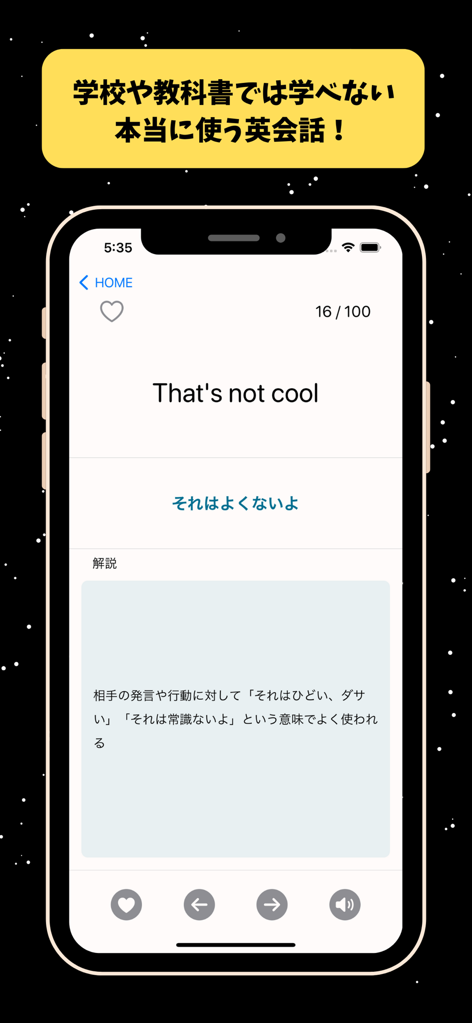 「簡単な単語だけなのに意味が理解できない」という経験ありませんか?それは、直訳できない「決まり文句やお決まりのセリフ」だからです。ネイティブはそんな決まり文句をくちぐせのように使っています。このアプリでは、そんな学校や教科書では学べないネイティブが本当に使う英会話フレーズを学ぶことができます。