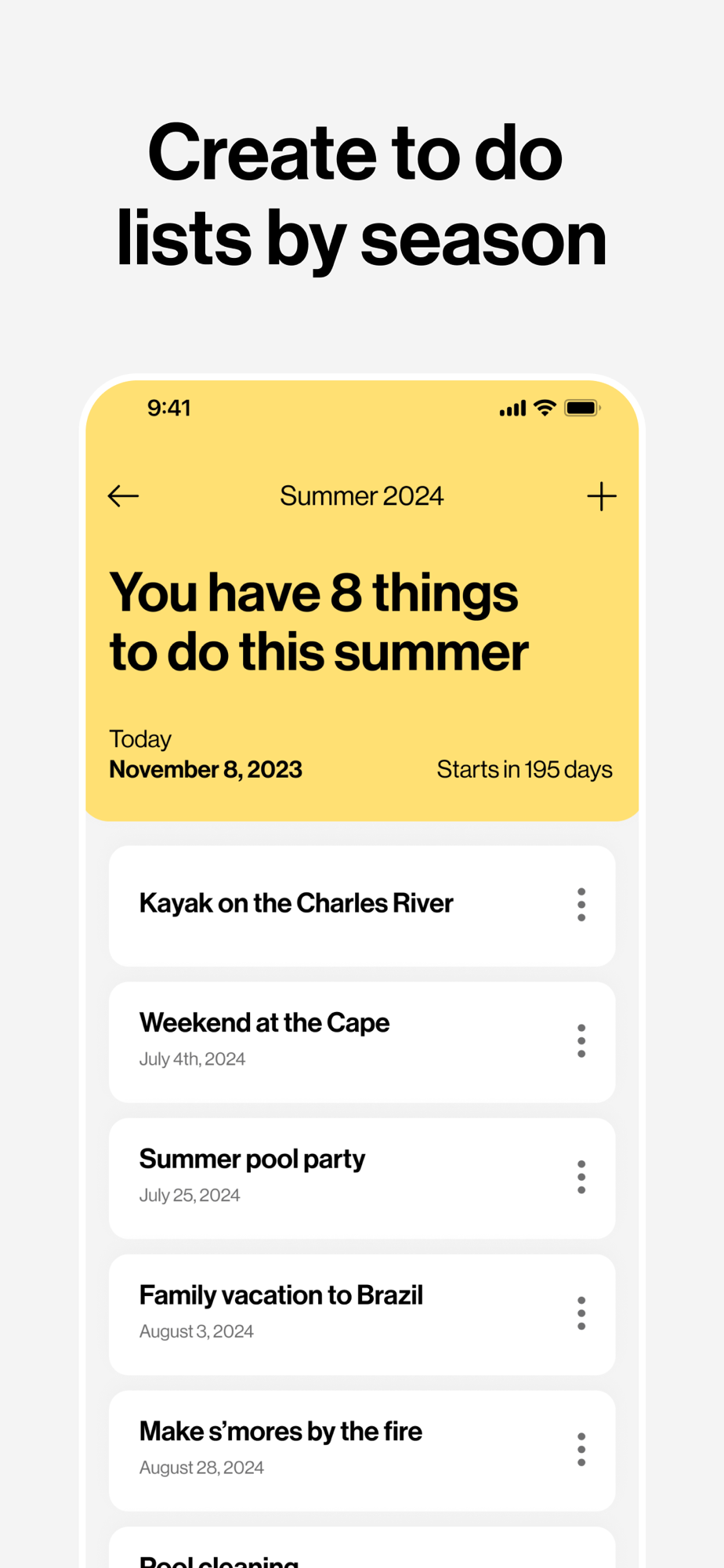 With "Seasons," you can now track, plan, and complete activities tailored for every part of the year. Whether it's picking apples in the fall, enjoying beach trips in the summer, or cozying up with a book in winter, "Seasons" helps you stay organized and make every season count.