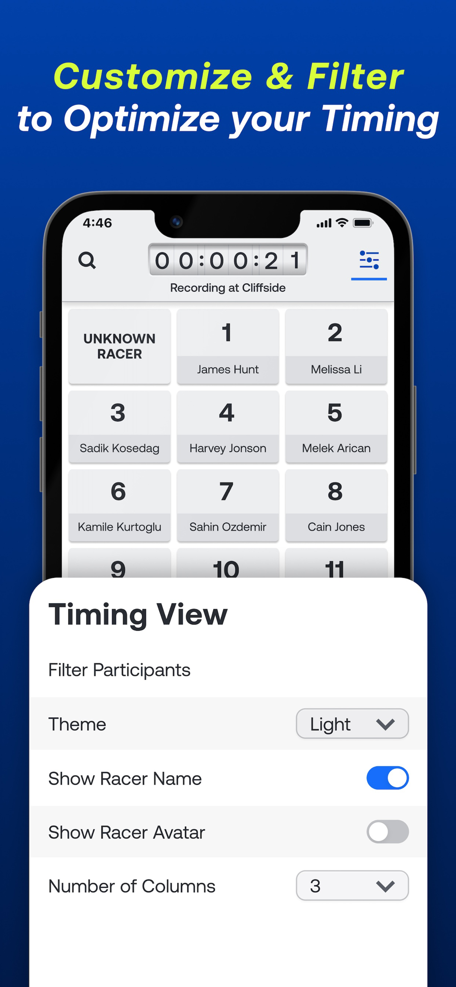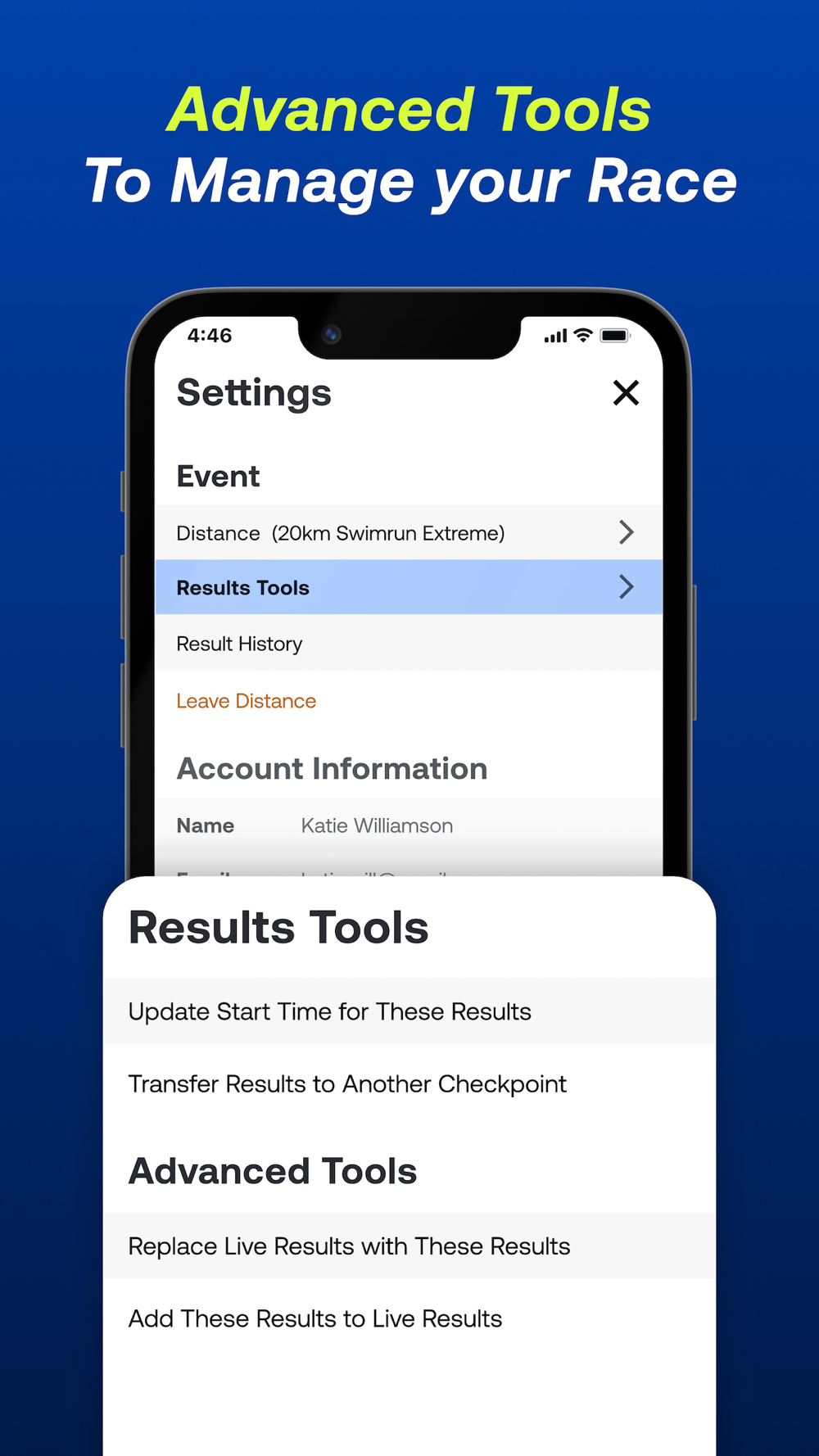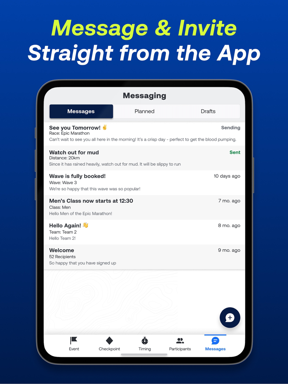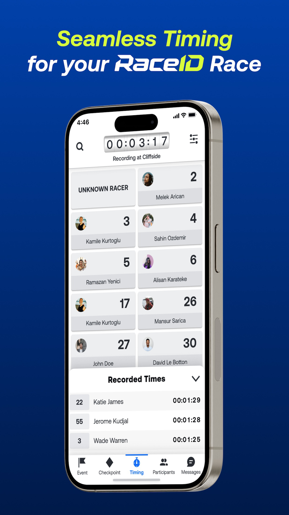 Record and manage results from the race track, with support for multiple devices and offline timing. You can also add, edit and message participants without leaving the app.