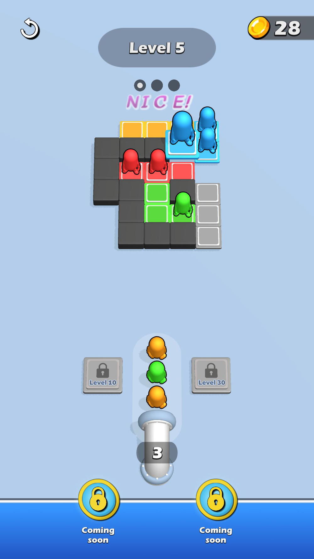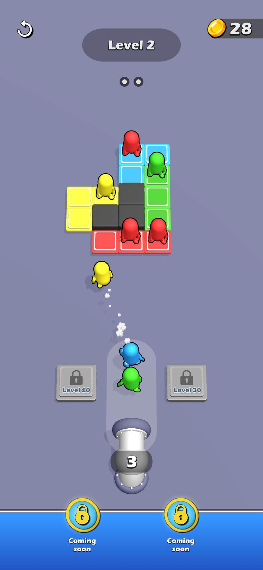 Your mission is simple: fill rooms with characters of the same color. Each room has three matching color slots, and once they are all filled, the room becomes neutral. You can even strategically place different characters on neutral tiles to help you reach your goal.