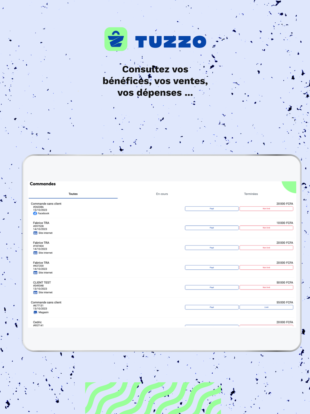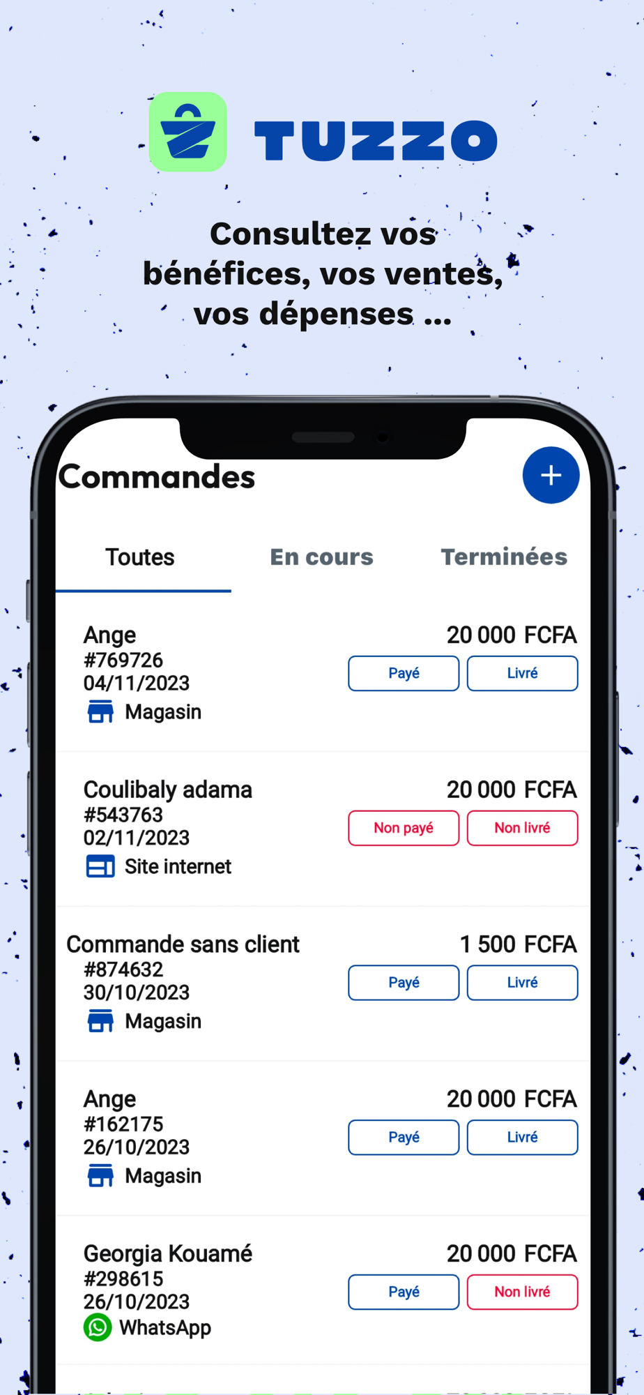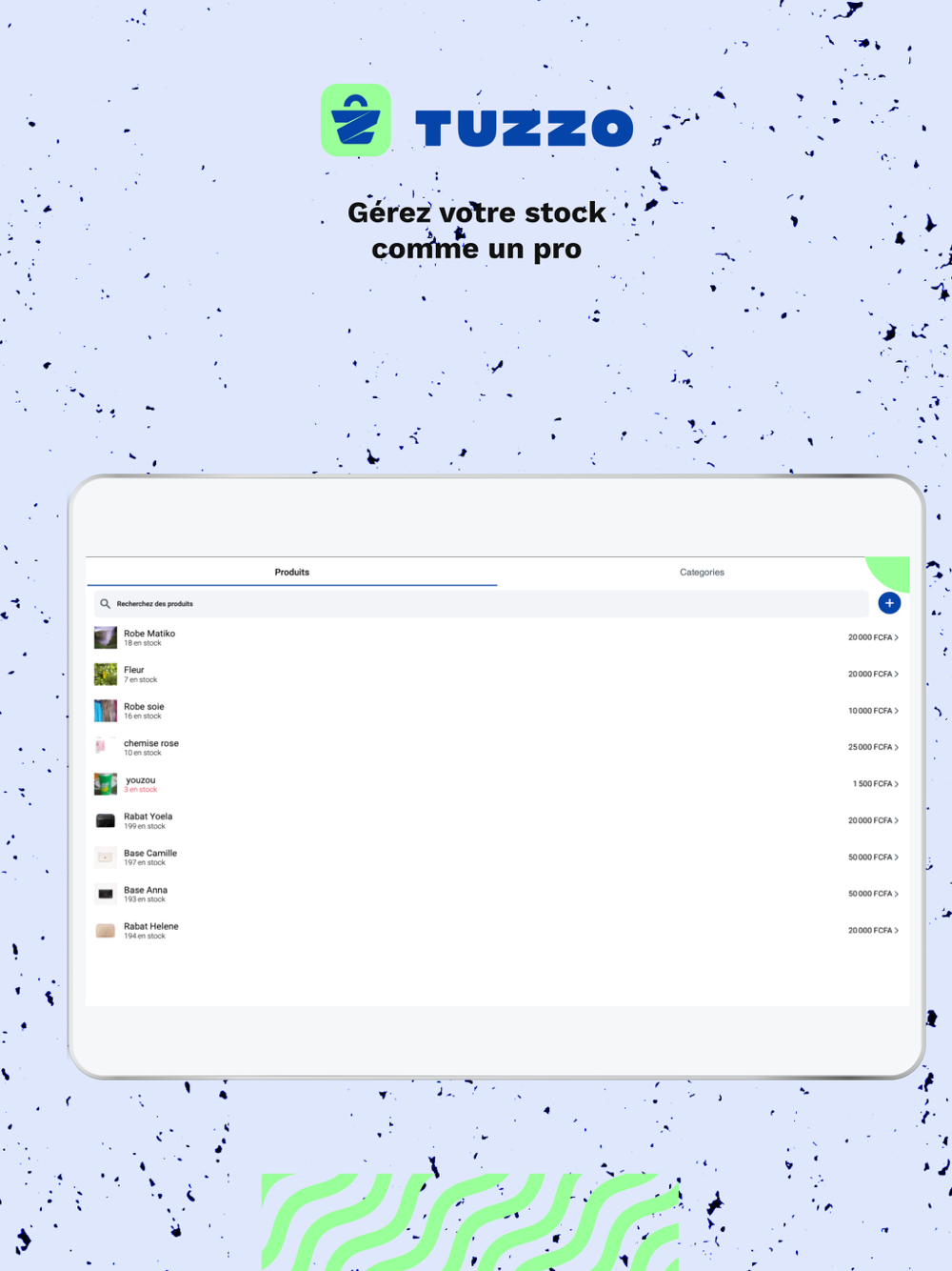 Avec Tuzzo vous pouvez gérer vos ventes dans votre magasin et gagner plus d'argent en vendant en ligne :