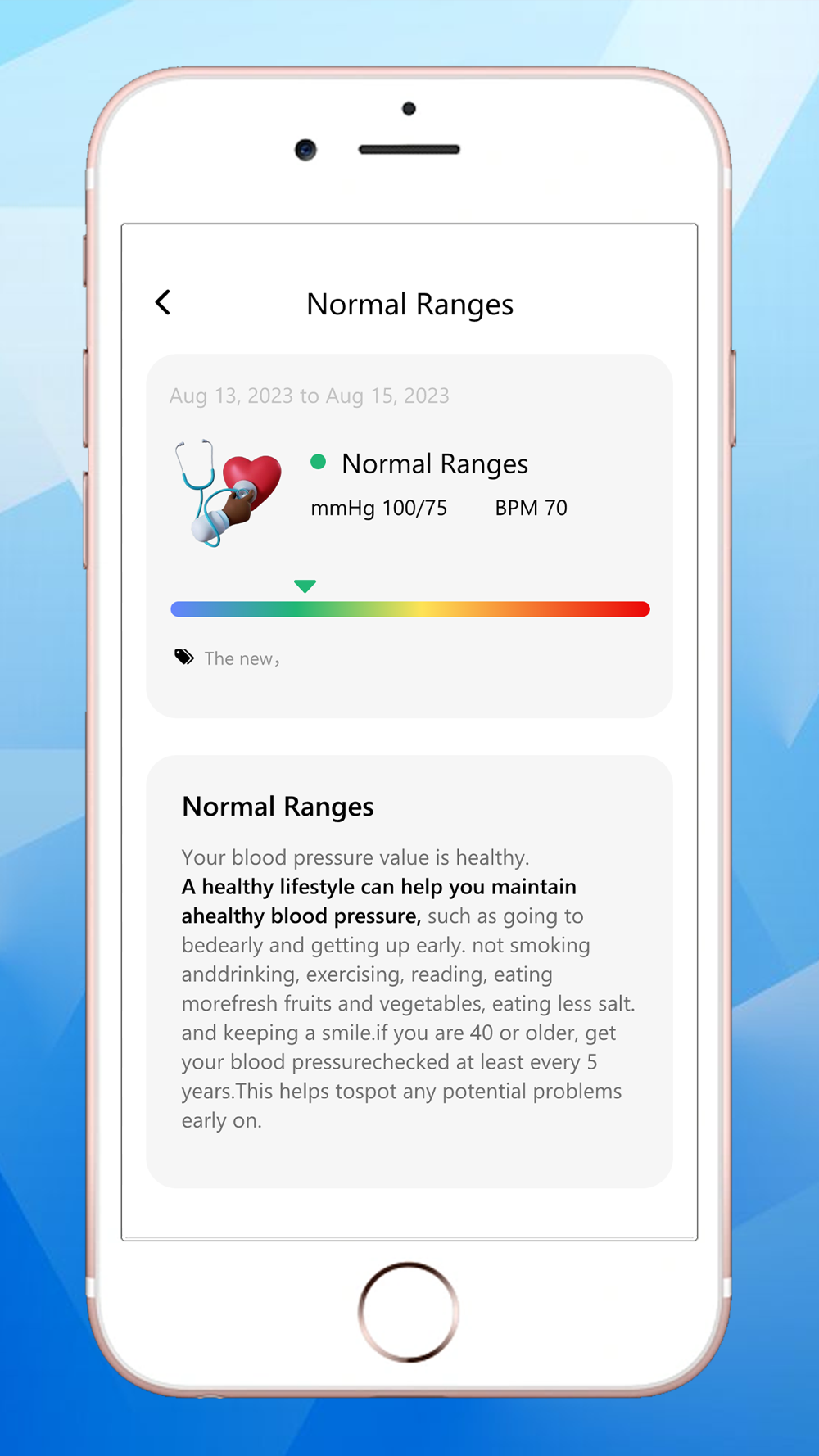 Please note that our app is not a substitute for professional healthcare. If you have persistent high or low blood pressure or other problems, please consult your doctor promptly.