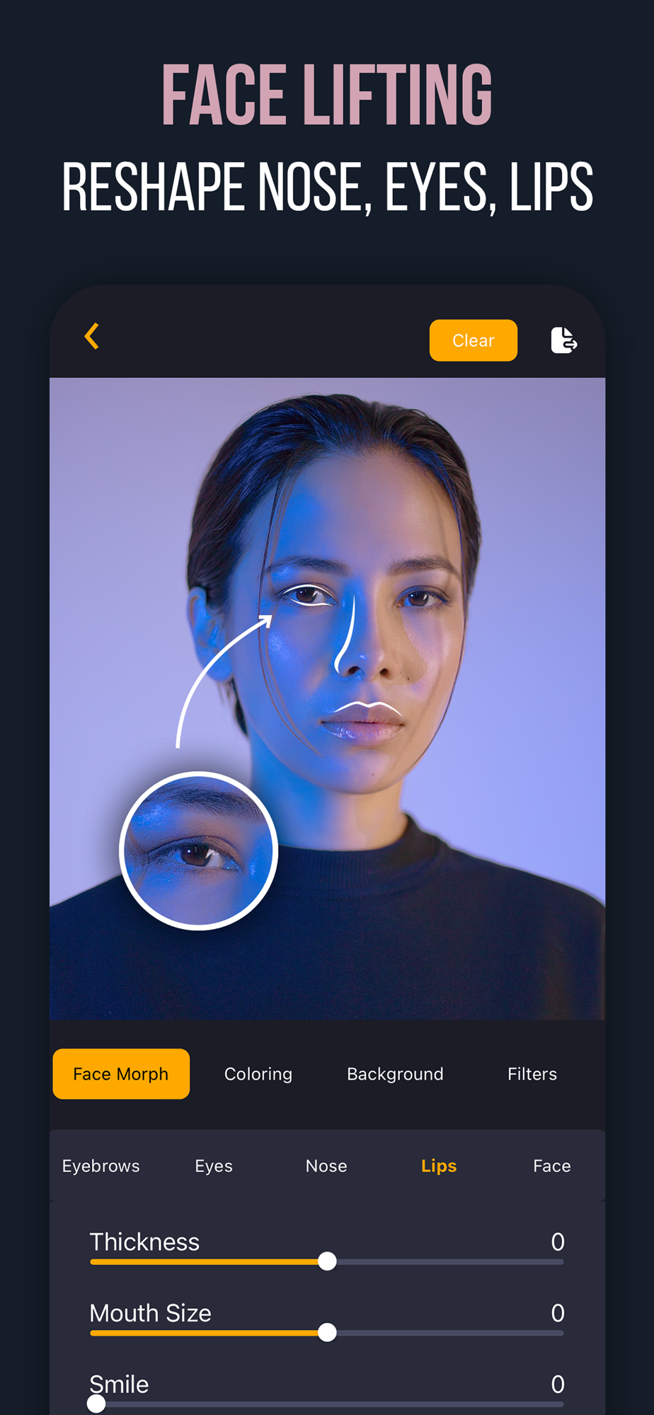 - Eyes: The ability to choose a new eye color, adding brightness and lightening effects for a more vivid portrait.
