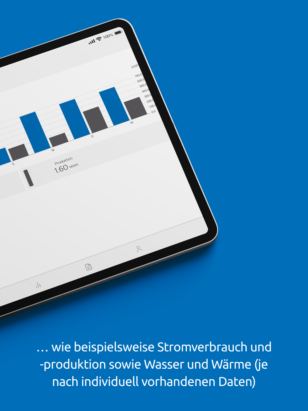 - Visualisierung Ihrer Energiedaten wie beispielsweise Stromverbrauch und -produktion oder auch Wärme (je nach individuell vorhandenen Daten)