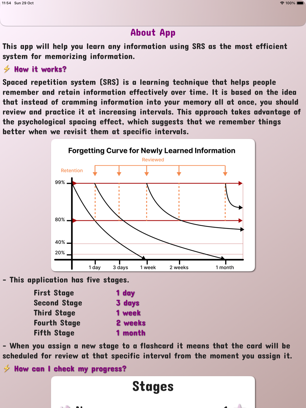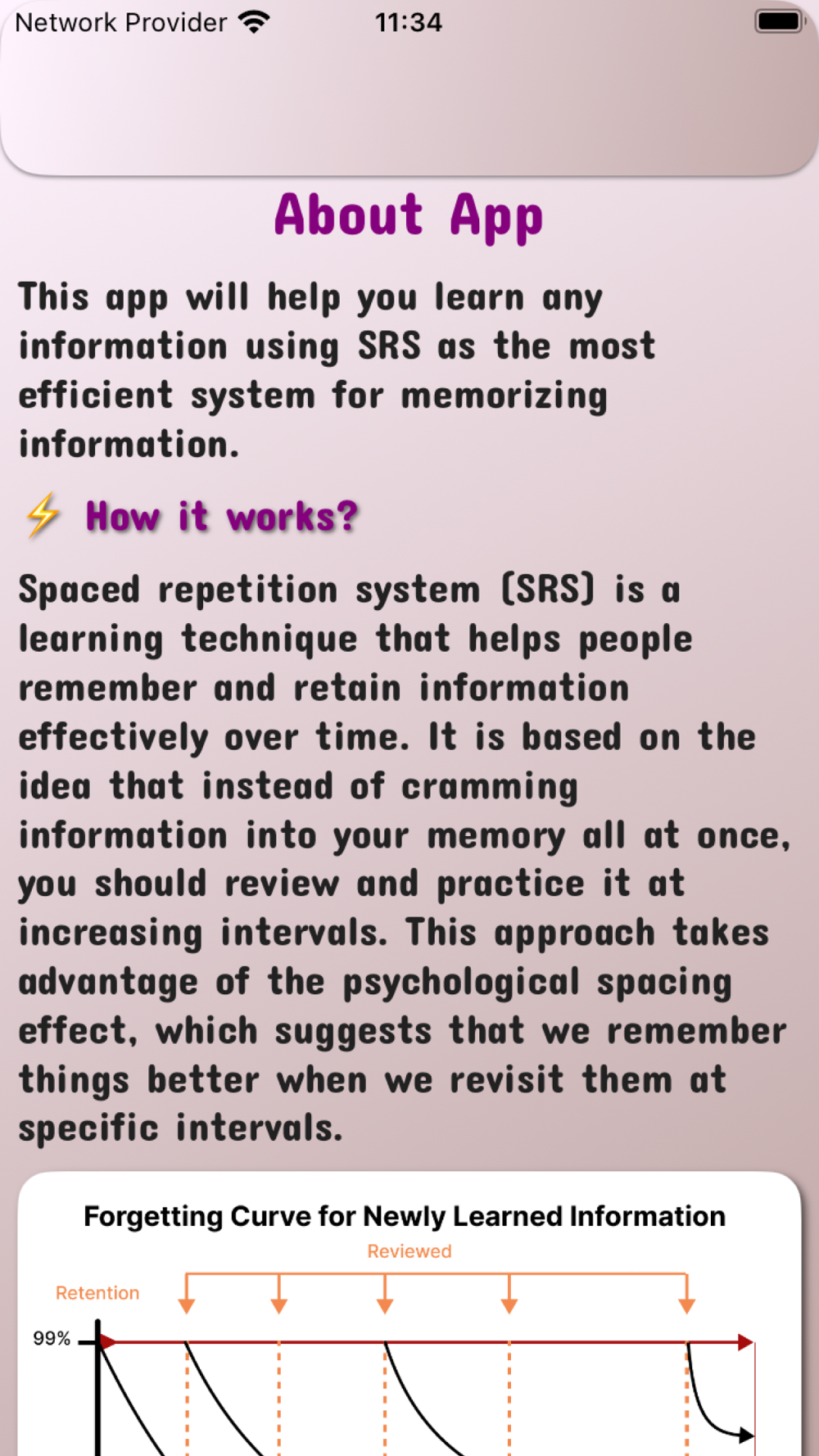 This app will help you learn any information using SRS as the most efficient system for memorizing information.