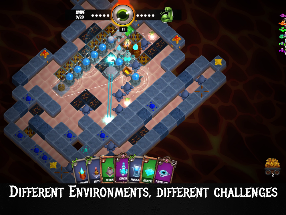 Utilize your basic towers for path creation, and enhance their capabilities with upgrade cards you discover during your journey. These cards hold the power to turn the tide in your favor, creating strategic chokepoints that thwart your foes. Customize your arsenal by building your deck with a wide array of upgrade cards, each offering unique abilities to tackle the diverse threats you'll face.